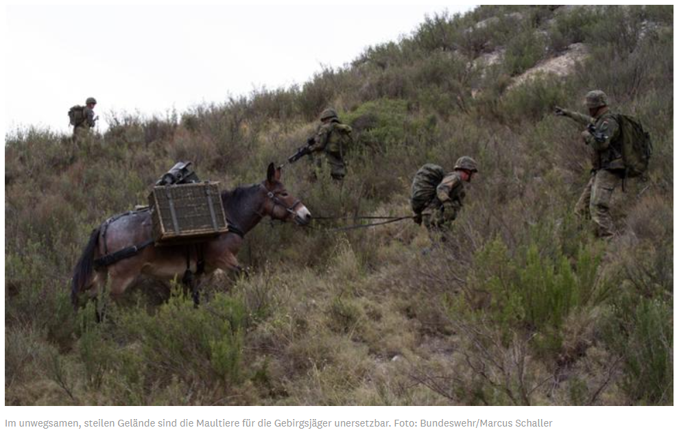 Τα μουλάρια όμως του 5ου λόχου των Ορεινών Κυνηγών (Gebirgsjäger) παραμένουν ακόμα αναντικατάστατα. “Das Muli ist der beste Kamerad”, το μουλάρι είναι ο καλύτερος σύντροφος, και δικαίως γιατί κάθε ένα από αυτά μεταφέρει 140 κιλά οπλισμού, πυρομαχικών και εφοδίων στις πιο απόκρημνες γωνιές των Άλπεων, και όχι μόνο.