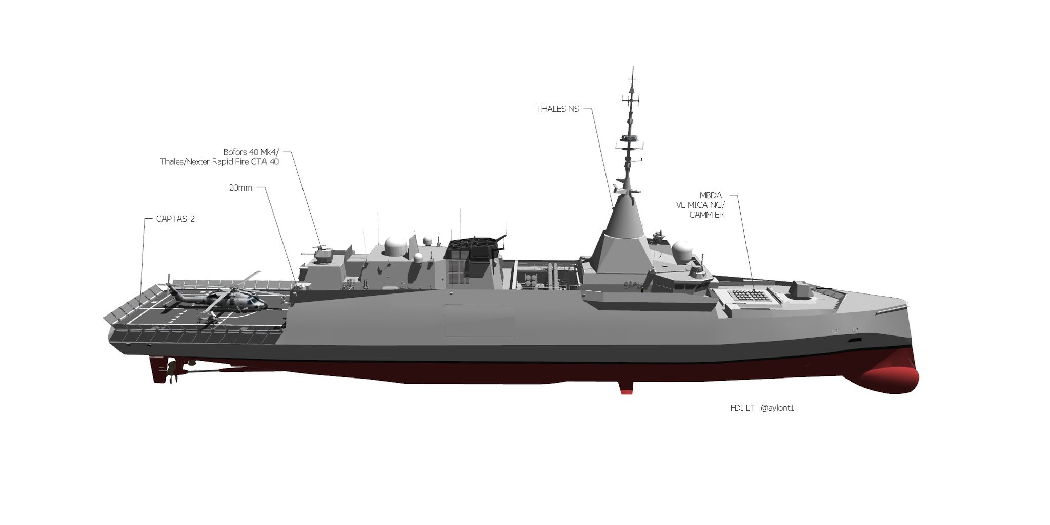 Πριν λίγες μέρες, διαβάσαμε μια ιδέα στη σελίδα navalanalyses.com. Εκεί λοιπόν, προτάθηκε μια FDI Light, όπου θα γίνονται χρήση του κύτους της FDI, αλλά με τα ηλεκτρονικά και όπλα που φέρει μια κορβέτα Gowind HN. Δηλαδή στη θέση του ραντάρ SeaFire θα είχαμε ένα Thales NS100/110, και στη θέση των αντιαεροπορικών πυραύλων Aster 30 θα μπορούσαμε να είχαμε είτε MICA NG, είτε CAMM-ER. Στη δε θέση του εκτοξευτή RAM, θα έμπαινε ένα αντιαεροπορικό πυροβόλο 40mm, ενώ το συρόμενο σόναρ θα ήταν ένα CAPTAS-2. Όλα αυτά με την προοπτική χαμηλότερου κόστους, ανά μονάδα, διατηρώντας όμως την ομοιοτυπία, ως προς τα μηχανολογικά μέρη (ίδιο σκάφος) και σε πολλά ηλεκτρονικά, με την “κανονική” FDI.