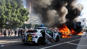 Η αστυνομία της αμερικανικής μεγαλούπολης χαρακτήρισε κάποιες συγκεντρώσεις «παράνομες», ισχυριζόμενη ότι οι διαδηλωτές πέταξαν κομμάτια τσιμέντου, μπουκάλια και άλλα αντικείμενα στην αστυνομία. Πολλά αυτοκινούμενα οχήματα της υπηρεσίας ταξί Waymo πυρπολήθηκαν σε κεντρικό δρόμο του Λος Άντζελες χθες το βράδυ, σύμφωνα με εικόνες από βίντεο.