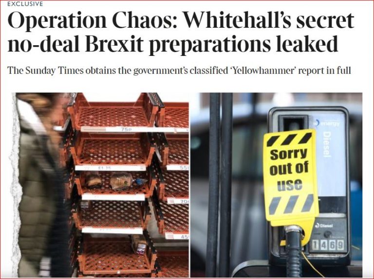 Σύμφωνα λοιπόν με τους Sunday Times, τα έγγραφα αυτά (που ετοιμάστηκαν στο πλαίσιο ενός προγράμματος με την κωδική ονομασία “Yellowhammer“) εξετάζουν τις πιθανότερες συνέπειες του no-deal Brexit και όχι τα χειρότερα πιθανά σενάρια. O Μάικλ Γκόουβ έσπευσε να διαψεύσει (ως υπουργός αρμόδιος για τον συντονισμό των ετοιμασιών για την αποχώρηση από την ΕΕ χωρίς συμφωνία), δηλώνοντας ότι τα έγγραφα που διέρρευσαν βασίζονται στο χειρότερο σενάριο. «Το Yellowhammer είναι το χειρότερο σενάριο, σημαντικά βήματα έχουν γίνει τις τελευταίες τρεις εβδομάδες προκειμένου να επιταχυνθεί ο σχεδιασμός του Brexιt», έγραψε ο Γκόουβ στο Twitter.