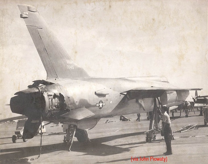 Ο ορίζοντας εξαφανίσθηκε καθώς η ουρά του «Thud» τινάχτηκε πάνω και προς τα αριστερά ενώ το ρύγχος σημάδευε το χαλί από ορυζώνες κάτω μου. Ο πίνακας οργάνων γέμισε προειδοποιητικά φώτα και για μερικά δευτερόλεπτα τα όργανα τρελλάθηκαν όπως πήγαινε το αεροπλάνο. Οι φωτεινές ενδείξεις έλεγαν για φωτιά και απώλεια υδραυλικής πίεσης. Έκοψα το μοτέρ που έστελνε υδραυλικό υγρό στα αερόφρενα και στην περιοχή του ακροφυσίου, το πιθανότερο σημείο για φωτιά.