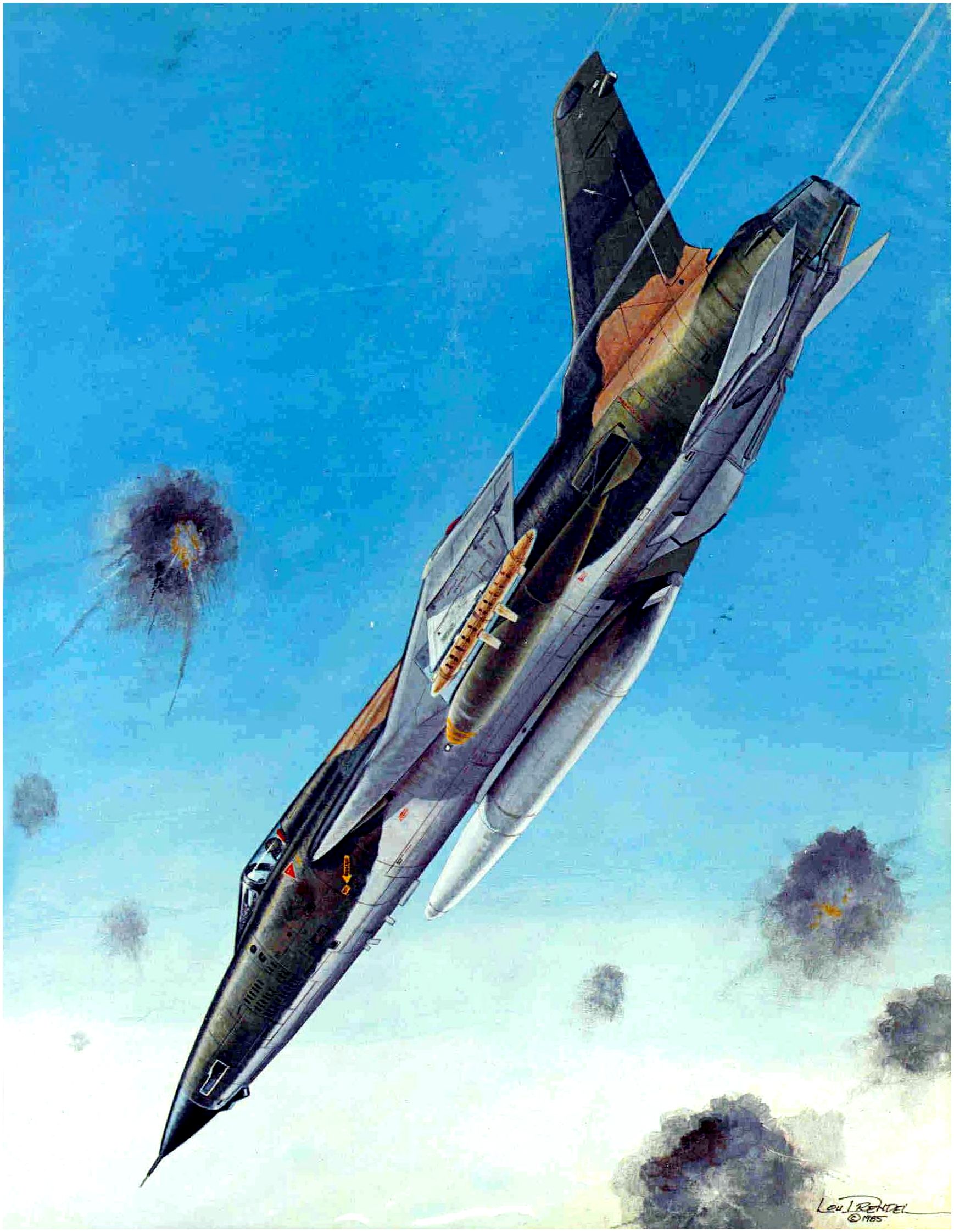 Τράβηξα απότομα αριστερά και κατευθυνόμουν παράλληλα με το ρεύμα με 630 κόμβους ψάχνοντας για το σμήνος μου. Ξαφνικά είδα κάτι πράγματα σε μέγεθος μπουκαλιού Μπωζολέ να περνούν δίπλα από το κόκπιτ –85άρια! Βαρύ αντιαεροπορικό πυρ, κατευθυνόμενο με ραντάρ! Ήμουν αρκετά μίλια μακριά από το κέντρο του Ανόϊ και αισθανόμουν ανίκητος και αόρατος. Εκεί που ετοιμαζόμουν να βάλω το αεροπλάνο σε δεξιά στροφή για να συναντήσω τον Σμήναρχο Mac, έκρηξη!