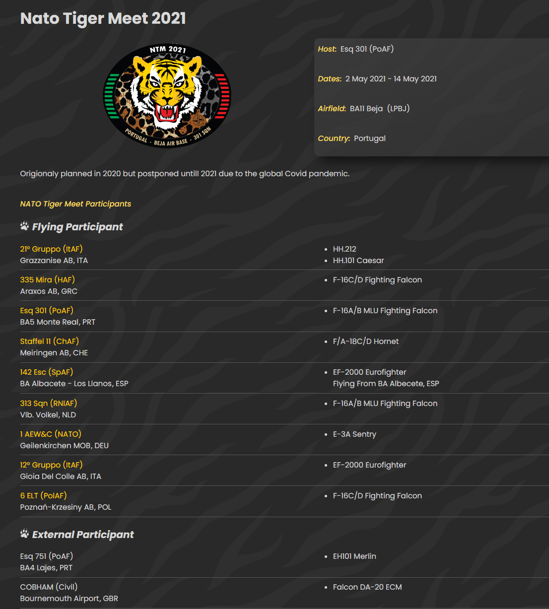 Στην αεροπορική βάση της Μπέχα στην Πορτογαλία θα βρεθούν τέσσερα F-16 Block 52+ Advanced της 335 Μοίρας “Τίγρης” από την 116 ΠΜ στον Άραξο, στα πλαίσια της άσκησης NATO Tiger Meet 2021.