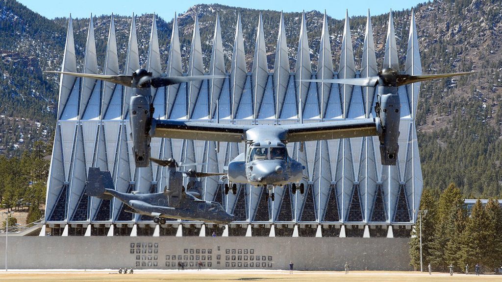 CV-22 σε εκπαίδευση στην U.S. Air Force Academy στο Κολοράντο, με φόντο το χαρακτηριστικό παρεκκλήσι της. (Πηγή @Aviation_Intel)