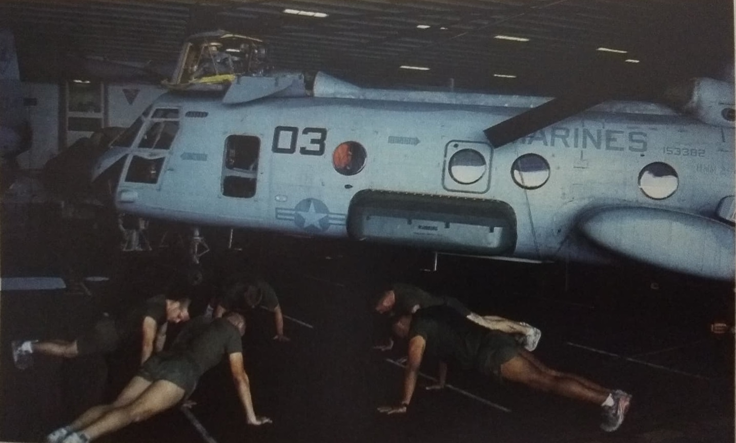 Άσκηση με φόντο ένα ελικόπτερο CH-46E στο υπόστεγο του SAIPAN.