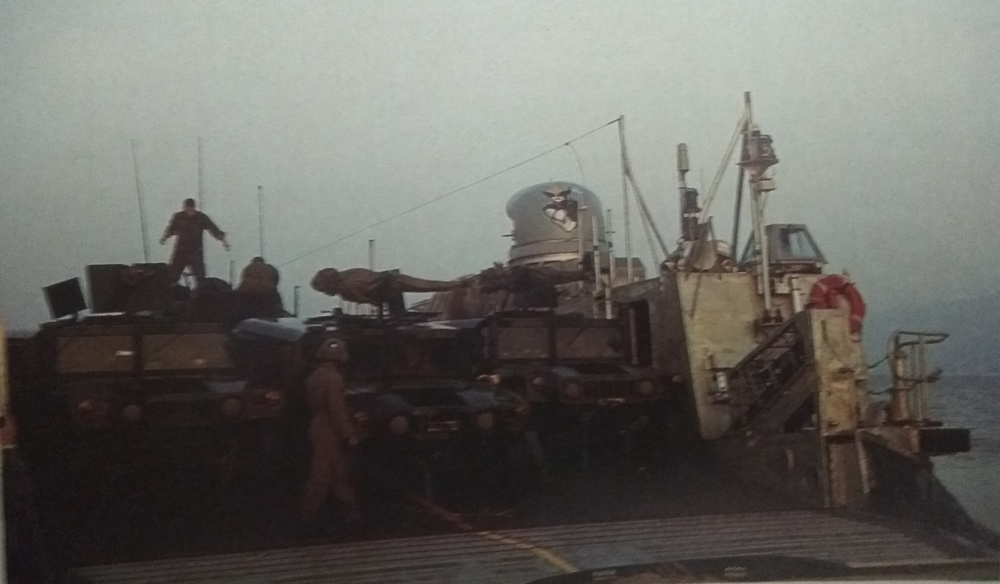 Μετά την ενημέρωση, άρχισε η περιήγηση σε μερικούς από τους χώρους του USS SAIPAN, αρχίζοντας από τα διάφορα υποστρώματα όπου είχαμε την ευκαιρία να δούμε όλη τη σειρά του αποβατικού εξοπλισμού που είχε σχολαστικά ετοιμασθεί για την απόβαση της επομένης. Ήταν πράγματι εντυπωσιακός ο τρόπος οργάνωσης και στιβασίας των διαφόρων υλικών που θα μεταφέρονταν στην ακτή.
