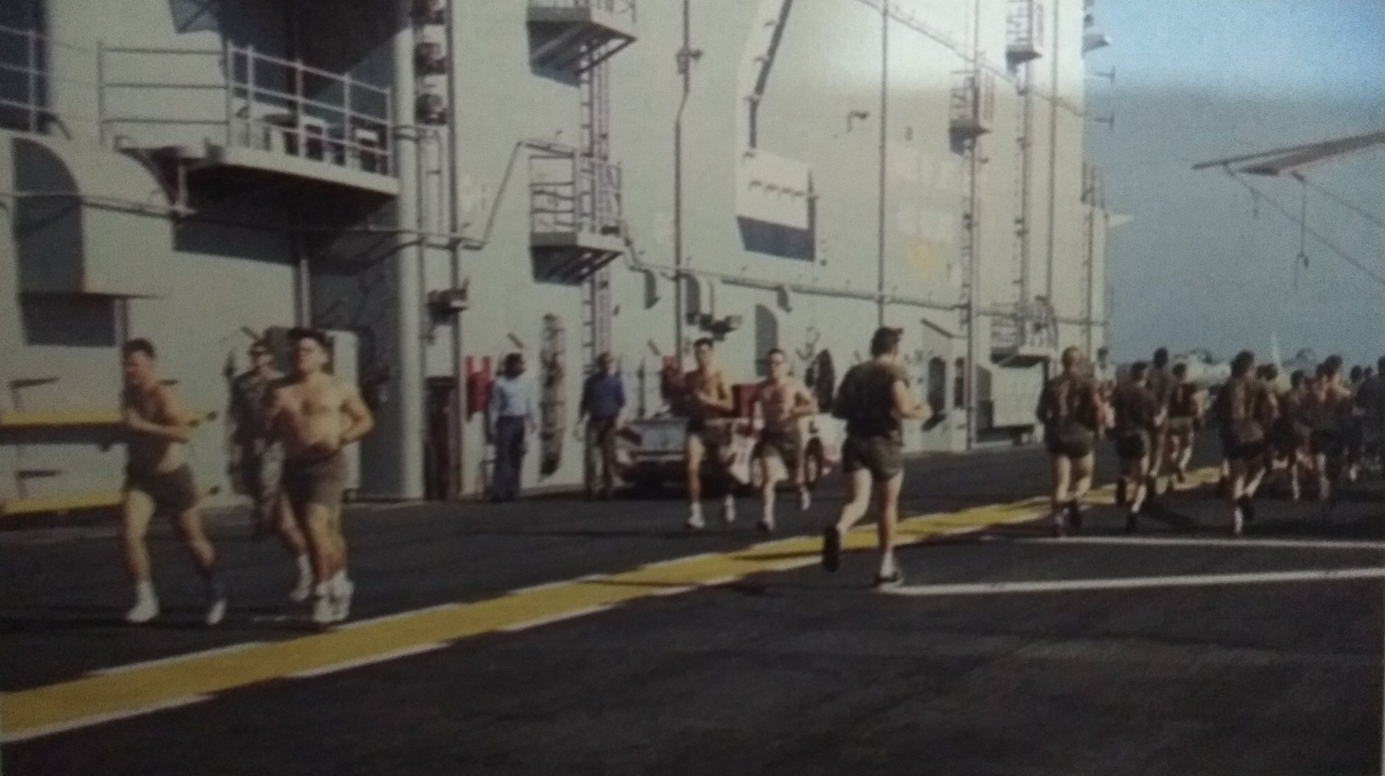 Το καλοκαιρινό απόγευμα είχε μετατρέψει το κατάστρωμα σε έναν τεράστιο χώρο άθλησης των πεζοναυτών (και όχι μόνο). Τη στιγμή της επίσκεψής μας ήταν σε εξέλιξη ένας αγώνας αντοχής! Το σκηνικό φάνταζε παράξενο κάτω από τον καλοκαιρινό ήλιο, τα παρατεταγμένα στις άκρες του καταστρώματος ελικόπτερα και αεροσκάφη και το Αιγαίο να καλύπτει και τα τέσσερα σημεία του ορίζοντα. Μετά την περιδιάβαση κάθε γωνιάς του καταστρώματος, αφήσαμε τον αγώνα να εξελίσσεται και κατεβήκαμε στην τραπεζαρία των αξιωματικών για το δείπνο.