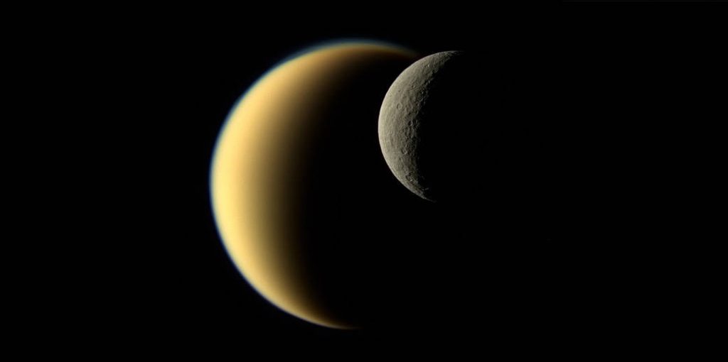 Η NASA επαναδημοσίευσε μια παλιότερη εικόνα που είχε τραβήξει το Cassini και απεικονίζει το δορυφόρο Ρέα να περνάει μπροστά από τον Τιτάνα. Οι διαφορές των δυο δορυφόρων του Κρόνου είναι εκπληκτικές. Από τη μια, η Ρέα είναι ένας κόσμος γεμάτος κρατήρες και ο Τιτάνας έχει μια εξαιρετικά πυκνή ατμόσφαιρα αζώτου και λίμνες υδρογονανθράκων, όντας το μοναδικό σώμα στο πλανητικό μας σύστημα μαζί με τη Γη, με υγρό στην επιφάνειά του.