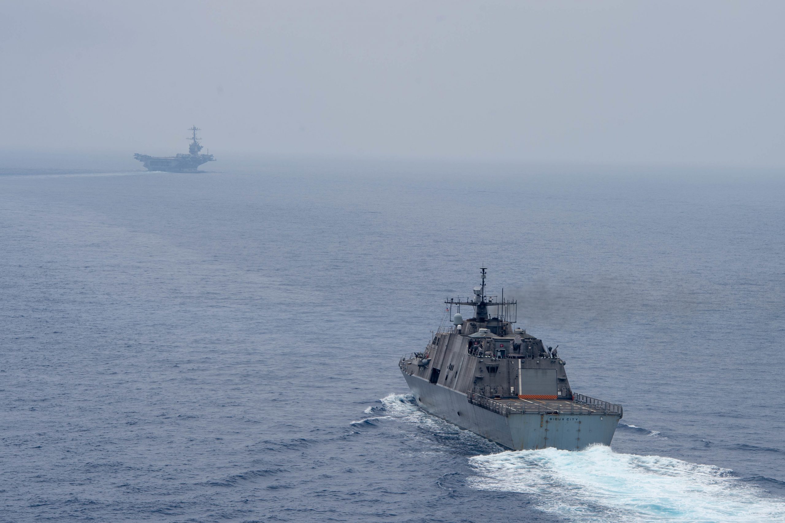 220516-DN159-1138 TYRRHENIAN SEA (May 16, 2022) The Freedom-variant littoral combat ship USS Sioux City (LCS 11) transits behind the Nimitz-class aircraft carrier USS Harry S. Truman (CVN 75), May 16, 2022. The Harry S. Truman Carrier Strike Group is on a scheduled deployment in the U.S. Sixth Fleet area of operations in support of U.S., allied and partner interests in Europe and Africa. (U.S. Navy photo by Mass Communication Specialist 3rd Class Crayton Agnew)
