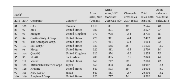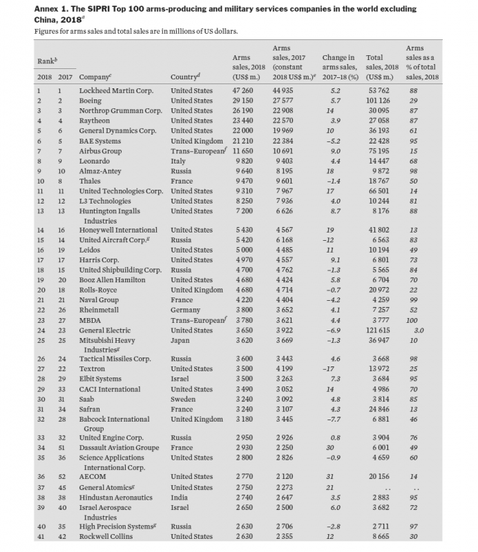 Ο σχετικός κατάλογος προέρχεται από το γνωστό μας SIPRI (Stockholm International Peace Research Institute) και αφορά το 2018, όπου ο κύκλος εργασιών των 100 μεγαλύτερων παραγωγών όπλων στον πλανήτη έφτασε τα 420 δις δολάρια, 4,6% αυξημένος σε σχέση με το 2017. Από αυτόν τα 36,2 δις αφορούν εξαγωγές.