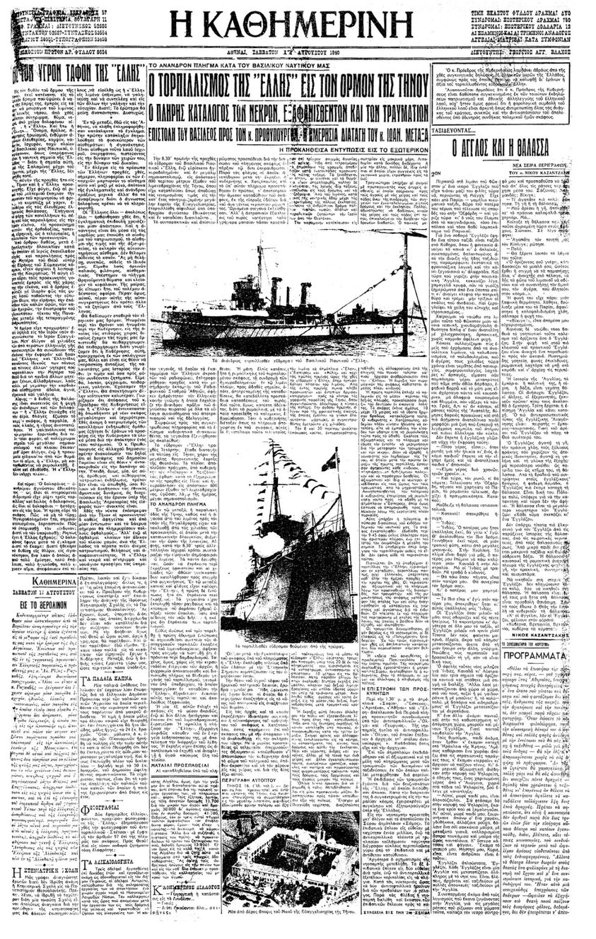 Σύμφωνα με το φύλλο της 17ης Αυγούστου 1940 της “Καθημερινής”, η “Έλλη”, βρισκόταν αγκυροβολημένη 800 μέτρα έξωθεν του λιμενοβραχίονα της Τήνου. Η εφημερίδα αναφέρει πως ευρέθησαν αμέσως υπολείμματα από τις τορπίλες, χωρίς όμως να αναφέρει την (ιταλική) προέλευσή τους. “Άνανδρος πράξη του άγνωστου πειρατού”. Η “Καθημερινή”, έκανε λόγο για 3 εκρήξεις. “Τα πάντα εσείσθησαν ωσαν να επρόκειτο περί εκρήξεως ηφαιστείου”.