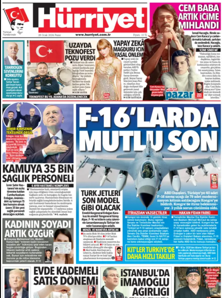 Αρκετά υποτονική όμως, και αυτό μας έκανε εντύπωση, είναι και η κάλυψη για την αμερικανική έγκριση περί πώλησης F-16 στην Τουρκία. Το λέμε αυτό γιατί περιμέναμε μεγαλύτερη προβoλή, την οποία δεν συναντήσαμε. Οπότε εδώ ανατρέπεται κάπως η αρχική μας αίσθηση πως υποβαθμίζεται μόνο η ελληνική παράμετρος! Όπου ούτε το εκεί εθνικό πρακτορείο Anadolu έχει κάποια εκτεταμένη κάλυψη και με ενθουσιώδη τόνο, ούτε υπάρχει (ακόμη) κάποια δήλωση Ερντογάν ή άλλου κορυφαίου αξιωματούχου. Ενώ σήμερα μόνο τρεις εφημερίδες ευρείας κυκλοφορίας έχουν το θέμα πρωτοσέλιδο και μόνο η Χουριέτ, από αυτές, ως κύριο θέμα. Η οποία με τίτλο “F-16 Ευτυχές τέλος” και δεύτερο τίτλο “τα τουρκικά τζετ θα είναι τελευταίου τύπου”, απηχεί περισσότερο ανακούφιση παρά κάποιο πανηγυρισμό.
