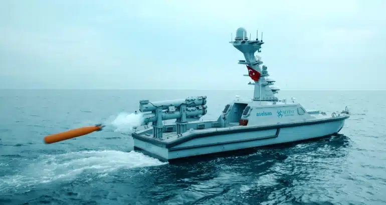 Το μη επανδρωμένο επιφανείας που έχουν αναπτύξει από κοινού η Aselsan και τα ναυπηγεία Sefine έκανε την τουρκική “πρωτιά” στην δοκιμή εξαπόλυσης τορπίλης. Το σκάφος έφερε στην πρύμνη ένα διπλό τορπιλοσωλήνα των 324 χιλιοστών και έκανε χρήση και των δύο, με δοκιμαστικές τορπίλες.