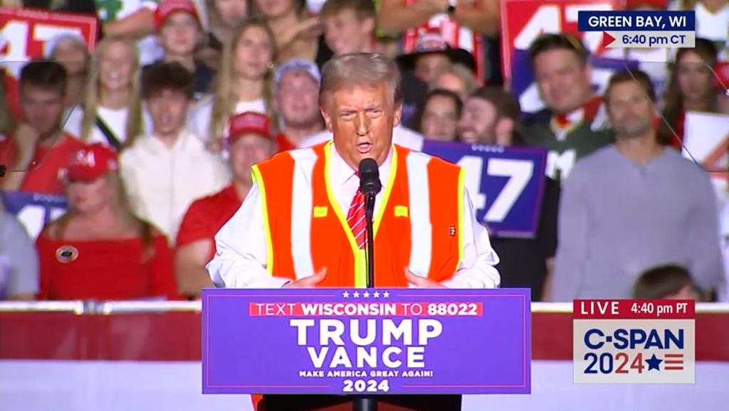 Στην ίδια ομιλία στο Green Bay, αφιέρωσε αρκετή ώρα να περιγράφει πως φθάνοντας στο κοντινό αεροδρόμιο, ανέβηκε σε ένα φορτηγό αποκομιδής σκουπιδιών, ως απάντηση στην χαρακτηρισμό “σκουπίδια”, που υποτίθεται πως είπε ο Μπάιντεν για τους οπαδούς του. Οπότε ο Τραμπ στην ομιλία είπε πόσο όμορφο ήταν το φορτηγό (!) και πόσο όμορφος ο οδηγός, που… έμοιαζε με τον Κάρι Γκράντ στα νιάτα του, και μετά “μου είπαν οι συνεργάτες μου να ανέβω στη σκηνή για την ομιλία φορώντας το ίδιο φωσφοριζέ γιλέκο ασφαλείας που φόρεσα για να ανέβω στο φορτηγό, και είπα “αποκλείεται” αλλά μετά μου είπαν πως με δείχνει κομψότερο, οπότε το δέχθηκα!”.