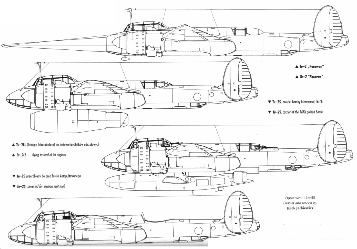 Το πιο περίεργο ήταν το Tu-2 Paravan (2 μονάδες), που διέθετε ένα τεράστιο ρύγχος τύπου «Πινόκιο» (μήκους 6 μέτρων), από το οποίο ξεκινούσε προς τα ακροπτερύγια ένα σύρμα πάχους 13,5 χιλιοστών, για να κόβει τα καλώδια των γερμανικών φραγμάτων από αερόστατα (balloon barrages). Aλλο ένα πρωτότυπο δοκίμασε πειραματικά (στο χώρο της αποθήκης βομβών) 88 υποπολυβόλα βάλλοντα προς τα κάτω, δηλαδή, το μεγαλύτερο αριθμό όπλων που έφερε ποτέ αεροσκάφος. Η εξέλιξη του Tu-2 τελειώνει στις 27/6/1947, όταν πέταξε το πρώτο από τα 4 τζετ βομβαρδιστικά Tu-12 (Tu-77). Εφοδιασμένο με τρίκυκλο σύστημα προσγείωσης και με στροβιλοκινητήρες RR Nene των 5.000 λιβρών, το πρώτο τζετ βομβαρδιστικό της Ε.Σ.Σ.Δ. έφτανε τα 783 χ.α.ώ., αλλά δεν εισήλθε ποτέ σε μαζική παραγωγή, λόγω της εμφάνισης, το 1948, του πολύ ανώτερου Il-28.