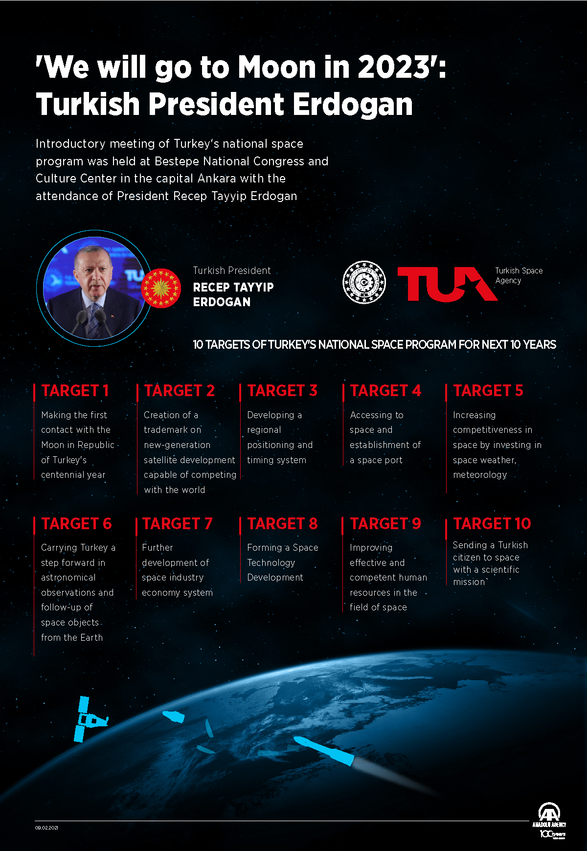 Χθες λοιπόν, μέσω Ερντογάν, η Τουρκική Διαστημική Υπηρεσία (TUA) εξήγγειλε το δικό της δεκαετές πρόγραμμα με 10 συγκεκριμένους στόχους. Ο πιο εντυπωσιακός είναι η αποστολή στο διάστημα ενός Τούρκου αστροναύτη αλλά οι ενδιάμεσοι είναι πιο ενδιαφέροντες καθώς αποκαλύπτουν μια στρατηγική πολλών βημάτων. Έτσι το 2023 -όπου θα γιορταστεί η εκατονταετία από την ίδρυση του τουρκικού κράτους- τίθεται ως όριο για την επίτευξη μιας «σκληρής» προσγείωσης οχήματος στην Σελήνη (δηλαδή να προσκρούσει στην επιφάνεια της), ενώ το 2028 στόχος είναι να γίνει κανονική προσελήνωση με το πυραυλικό όχημα να έχει κατασκευαστεί στην Τουρκία μαζί βέβαια με διεθνείς συνεργασίες.
