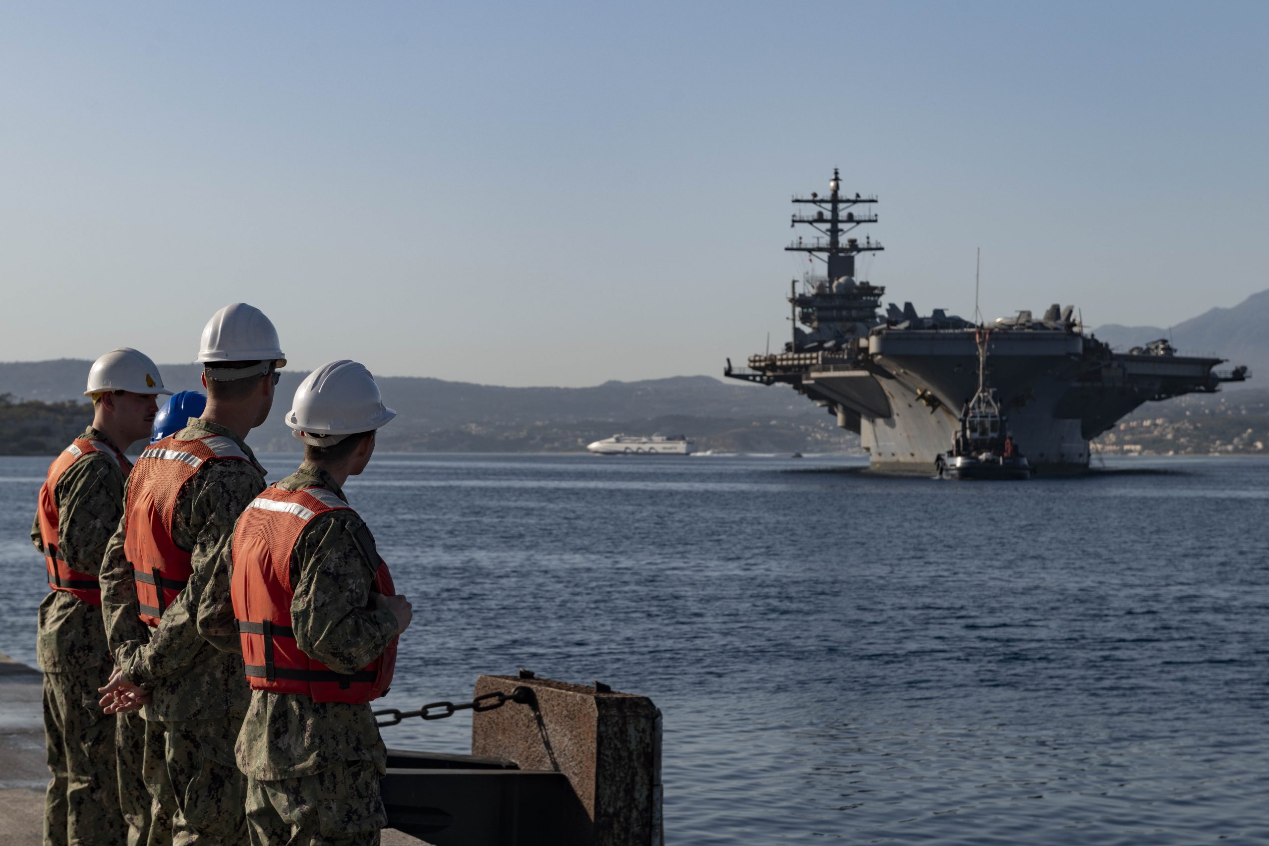 NAVAL SUPPORT ACTIVITY SOUDA BAY, Greece (June 25, 2024) Sailors assigned to Naval Support Activity (NSA) Souda Bay, prepare to moor the Nimitz-class aircraft carrier USS Dwight D. Eisenhower (CVN 69) at the NATO Marathi Pier Complex in Souda Bay, Greece, during a scheduled port visit on June 25, 2024. NSA Souda Bay provides logistical and operational support to the components of the Dwight D. Eisenhower Carrier Strike Group, which arrived in the Eastern Mediterranean after an eight-month deployment in the U.S. 5th Fleet area of operations.  (U.S. Navy photo by Mass Communication Specialist 2nd Class Andrew Eder)