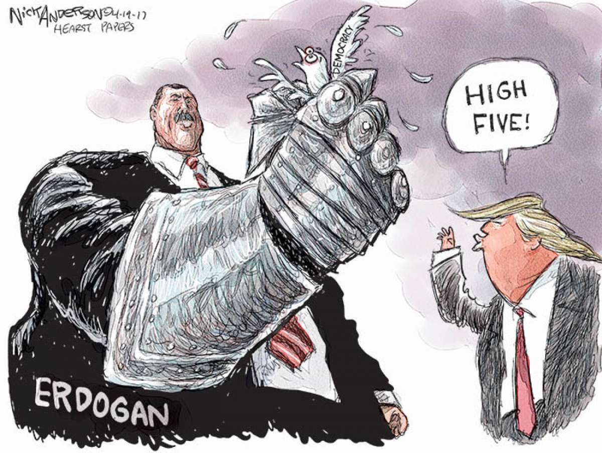 Όμως αν έτσι γλυτώσει η Τουρκία την «παρεξήγηση» της με τη γαλοπούλα, οι γελοιογράφοι διεθνώς έχουν κι άλλα εργαλεία. Καθώς πολλές φορές η Τουρκία και ειδικά ο Ερντογάν απεικονίζεται να ταλαιπωρεί, ένα άλλο πτηνό, το «περιστέρι της ειρήνης» και της Δημοκρατίας. Και εκεί δεν φταίει βέβαια η γαλοπούλα…