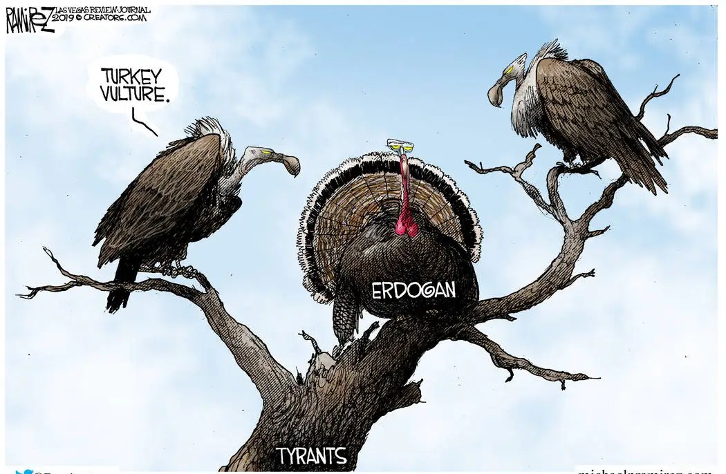 Όμως αν έτσι γλυτώσει η Τουρκία την «παρεξήγηση» της με τη γαλοπούλα, οι γελοιογράφοι διεθνώς έχουν κι άλλα εργαλεία. Καθώς πολλές φορές η Τουρκία και ειδικά ο Ερντογάν απεικονίζεται να ταλαιπωρεί, ένα άλλο πτηνό, το «περιστέρι της ειρήνης» και της Δημοκρατίας. Και εκεί δεν φταίει βέβαια η γαλοπούλα…