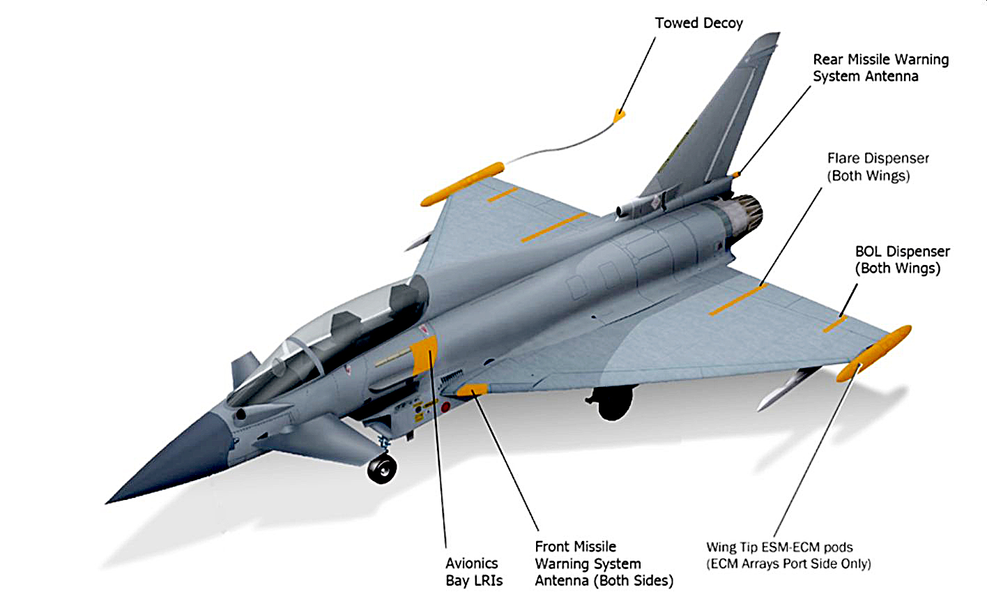 Το αναβαθμισμένο σύστημα ηλεκτρονικού πολέμου Praetorian του Tranche 5, που αναπτύχθηκε από το κονσόρτιουμ EuroDASS (Leonardo, ELT, Indra, Hensoldt), αποτελεί μια εξέλιξη του υπάρχοντος DASS, που δεν απαιτεί δομικές αλλαγές στο αεροσκάφος. Σχεδιασμένο για να εξασφαλίσει την επιβιωσιμότητα του Typhoon πέρα από το 2060, το νέο Praetorian ενσωματώνει τεχνολογίες “γνωστικού ηλεκτρονικού πολέμου” (Cognitive Electronic Warfare – CEW), που βασίζονται σε τεχνητή νοημοσύνη και μηχανική μάθηση για δυναμική προσαρμογή σε νέες απειλές.