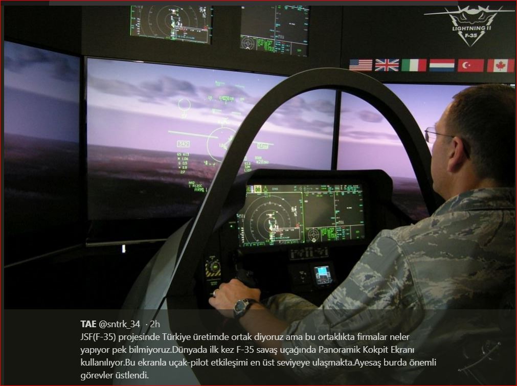 JSF (F-35) Εμείς ως Τούρκος συνεργάτης στην παραγωγή του έργου αναπτύξαμε για πρώτη φορά στα μαχητικά αεριωθούμενα F-35 την Πανοραμική οθόνη Panoramic Cockpit Display για εξαιρετική αλληλεπίδραση αεροπλάνου-πιλότου, με σημαντικό ρόλο εδώ, το υψηλότερο επίπεδο και δεν ξέρουμε η “έξοδος” της επιχείρησης τι μπορεί να προκαλέσει στην εταιρική σχέση. Η Ayesaş έκανε το σχεδιασμό του λογισμικού για της δομή πολλαπλών οθονών στην οθόνη (Panoramic Cockpit – PKE). Όλες οι κάρτες γραφικών του PKE παράγονται από την Ayesaş. Αυτά δεν είναι απλά υποσυστήματα, είναι κρίσιμα σύστημα και η AYESAŞ ο μόνος προμηθευτής τέτοιας ποιότητας εργασίας, όπως και οι άλλες εταιρείες που παράγουν αντίστοιχα υποσυστήματα θα έχουν κόστος εάν φύγουν από την κατασκευή του F-35.