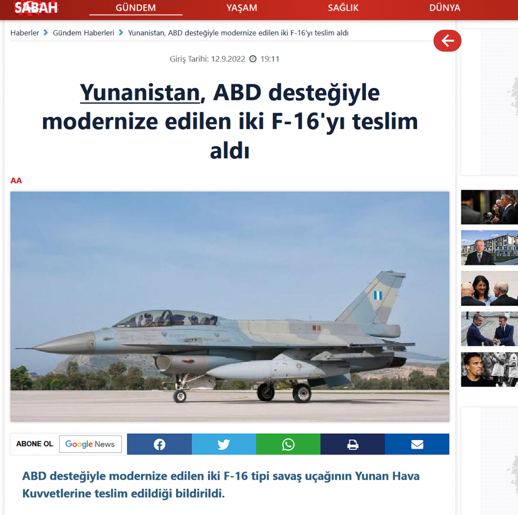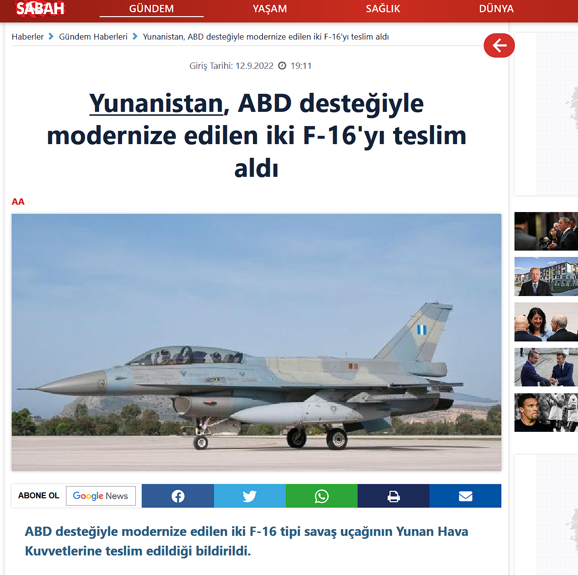 Χαμηλών τόνων, χωρίς πολλές λεπτομέρειες είναι η κάλυψη της πρώτης παράδοσης στην ελληνική Πολεμική Αεροπορία των αναβαθμισμένων F-16 Viper, από τα τουρκικά Μέσα Μαζικής Ενημέρωσης. Σήμερα οι περισσότερες τουρκικές εφημερίδες αναπαράγουν ένα τηλεγράφημα πρακτορείου, το οποίο εστιάζει πως η αναβάθμιση έγινε με την «υποστήριξη των ΗΠΑ», όχι δηλαδή με την συμμετοχή αμερικανικής εταιρίας (του κατασκευαστή Lockheed Martin) αλλά ευρύτερα. Τον ίδιο τίτλο και κείμενο συναντήσαμε σε Sabah, Aksam, Yeni Safak, Star, Sozku και στο TRT.