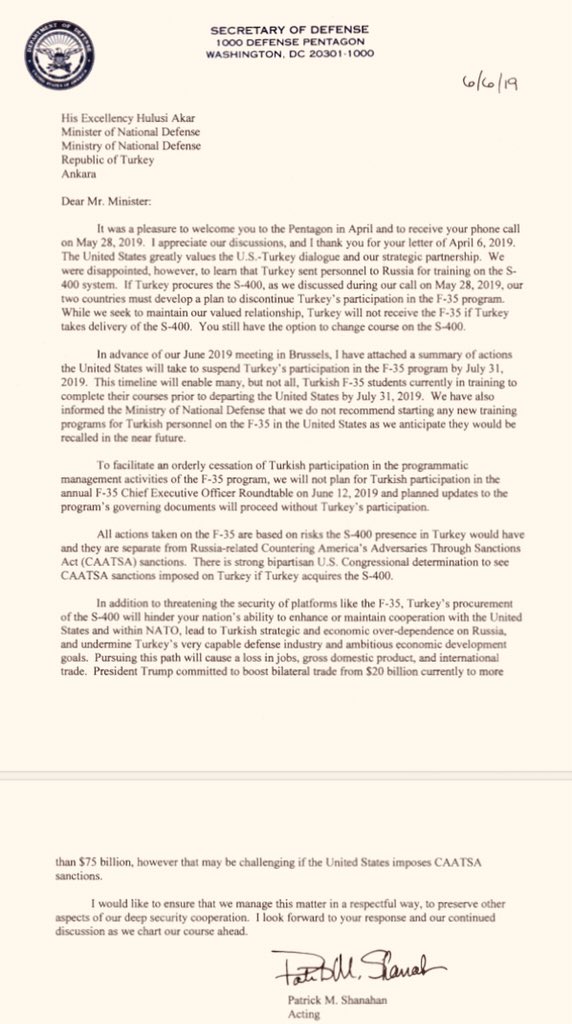 Το Πεντάγωνο ετοιμάζεται να μεταφέρει τη βιομηχανική συμμετοχή της Τουρκίας στο F-35 σε άλλες χώρες, εκτός εάν η Άγκυρα αναστρέψει την πορεία της προς την αγορά του ρωσικού συστήματος αεροπορικής άμυνας S-400. Η κίνηση – η οποία θα έθετε τέλος σε συμβάσεις στις αρχές του 2020 με σημαντικούς εργολάβους της Τουρκίας στον τομέα της άμυνας, όπως οι Turkish Aerospace Industries, η Roketsan και η Tusas Engine Industries μεταξύ πολλών άλλων – είναι ένα απ τα πολλά βήματα των ΗΠΑ που προτίθενται να κάνουν “σπρώχνοντας” την Τουρκία εκτός προγράμματος F- 35, σύμφωνα με επιστολή της 6ης Ιουνίου, από τον υπουργό Άμυνας Patrick Shanahan.
