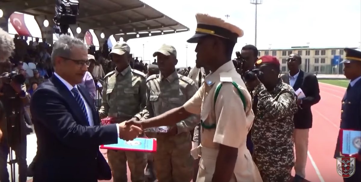 Στιγμιότυπα από την αποφοίτηση 47 Σομαλών υπαξιωματικών της πρώτης τάξης που υλοποιήθηκε στην τουρκική βάση στο Μογκαντίσου τα εγκαίνια της οποίας είχαν γίνει τον Αύγουστο του 2017. Προσέξτε τα τυφέκια τουρκικής κατασκευής MPT-76 που φέρουν οι εκπαιδευόμενοι.