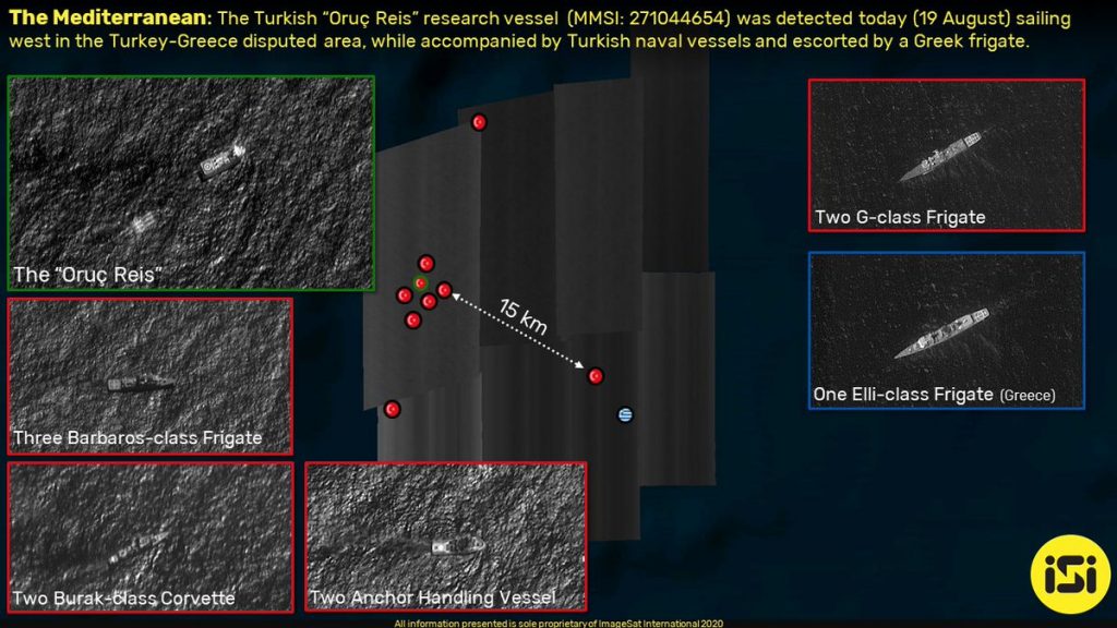The #Turkish “Oruç Reis” #research vessel was detected while sailing in the Turkey-Greece disputed area, accompanied by seven Turkish #naval vessels and two supply vessels. #Maritime #intelligence pic.twitter.com/0FCCeVaH8N