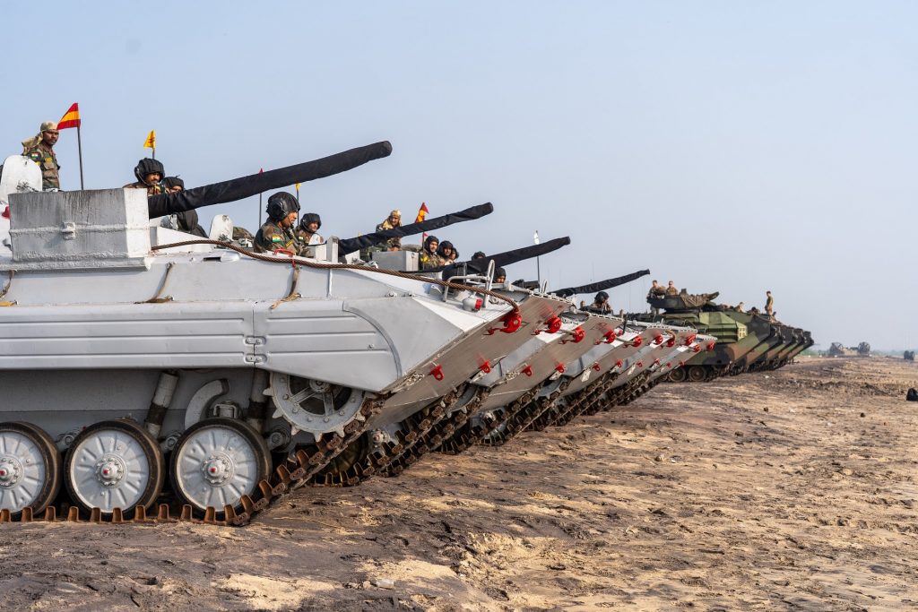 Αμερικανικά αμφίβια τεθωρακισμένα AAV-7 εξασκούνται πλάι σε ινδικά ΤΟΜΑ BMP-2