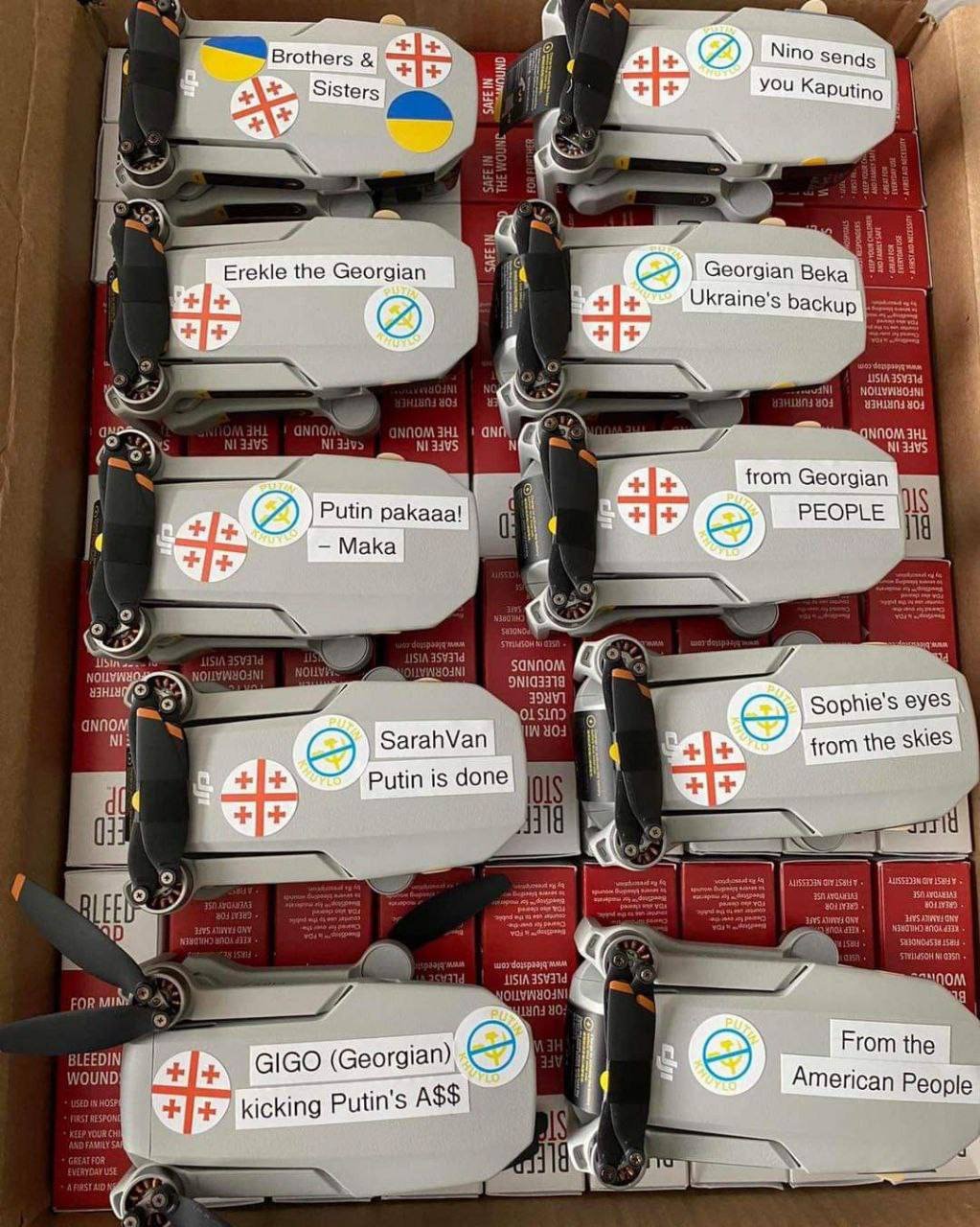 Κούτες με drones από τη Γεωργία, δωρεά στην Ουκρανία, με κάθε ένα να έχει ένα αυτοκόλλητο με συνθήματα ενθάρρυνσης.