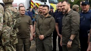 Ο Ουκρανός πρόεδρος Βολοντίμιρ Ζελένσκι επισκέφθηκε σήμερα την πλημμυρισμένη περιοχή της Χερσώνας, στη νότια Ουκρανία, για να συζητήσει τις επιχειρήσεις έκτακτης ανάγκης μετά τις πλημμύρες που προκάλεσε η καταστροφή τεράστιου φράγματος.