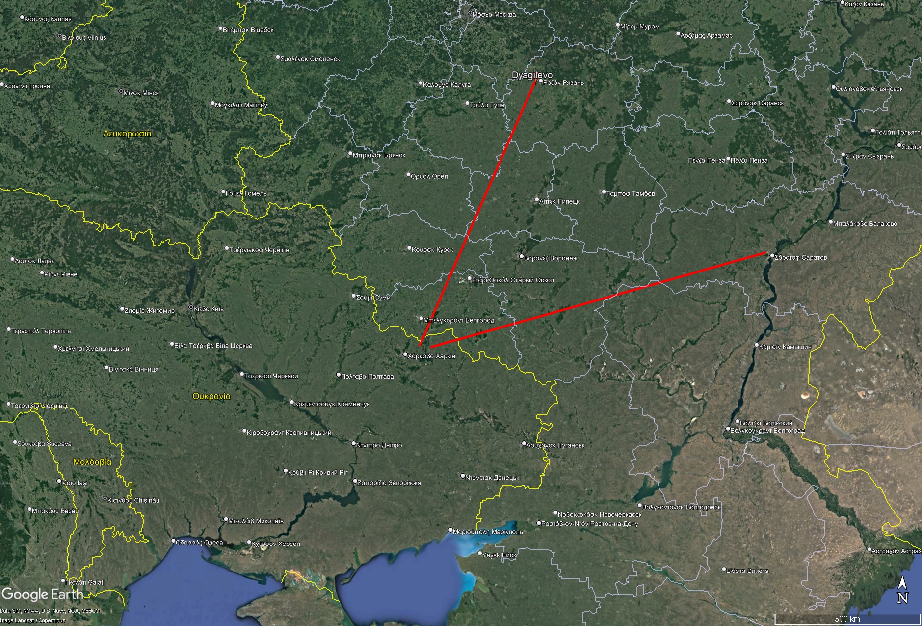 Απεικόνιση της απόστασης των 2 ρωσικών αεροδρομίων από την Ουκρανία, ενδεικτικά στο ύψος του Χαρκόβου. Πάνω είναι το Dyagilevo και κάτω, στις όχθες του Βόλγα το Engels.