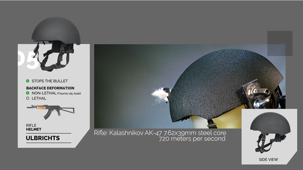 Η Ulbrichts υποστηρίζει ότι το κράνος από συνθετικά υλικά και τιτάνιο, περιορίζει την κινητική ενέργεια που απελευθερώνεται κατά την πρόσκρουση της σφαίρας, σε κάτω από 25 joules (από 2.000 joules), γεγονός που εξασφαλίζει την επιβίωση του στρατιώτη. Αξιοσημείωτο είναι επίσης πως το συγκεκριμένο κράνος ζυγίζει μόλις 500 γραμμάρια.