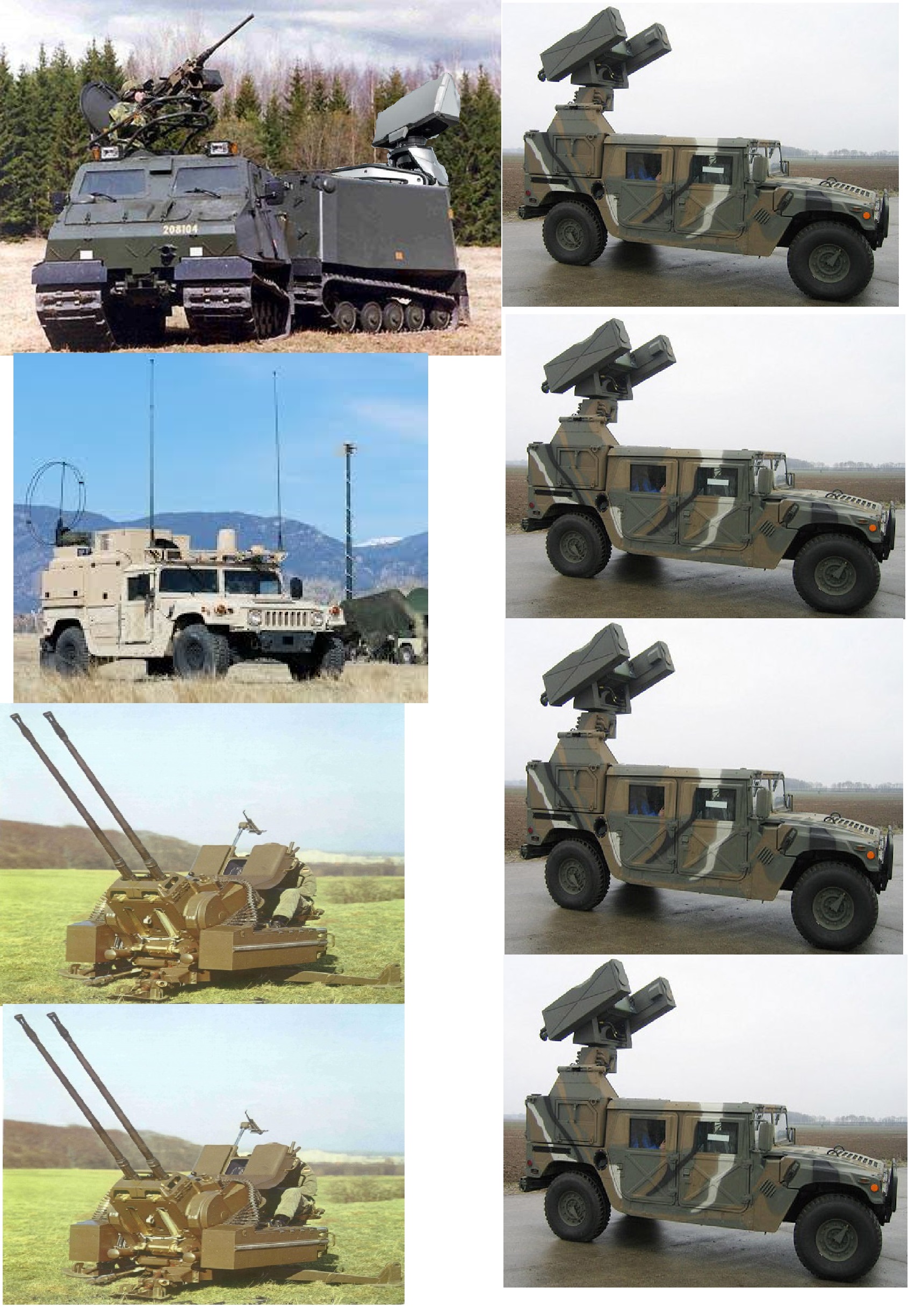 Μια προσπάθεια αναπαράστασης των στοιχείων που θα συνέθεταν ένα ελληνικό σύστημα V-SHORAD (από πάνω προς τα κάτω και κατά τη φορά του ρολογιού) 1. Ραντάρ 3D Giraffe 1X 2. 4x μονάδες βολής ASRAD-HELLAS 3. Κέντρο Διοίκησης-Ελέγχου επί οχήματος HMMWV 4. 2x Μονάδες πυρός Rh-202 των 20 mm