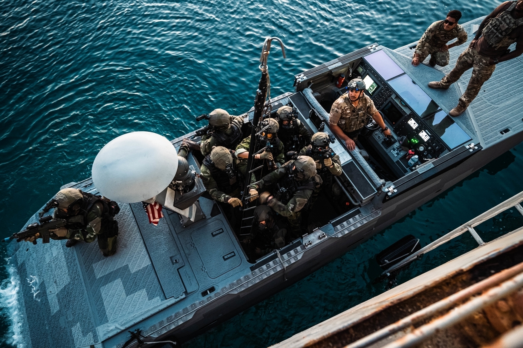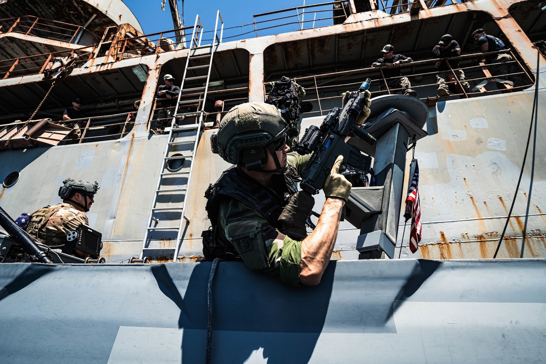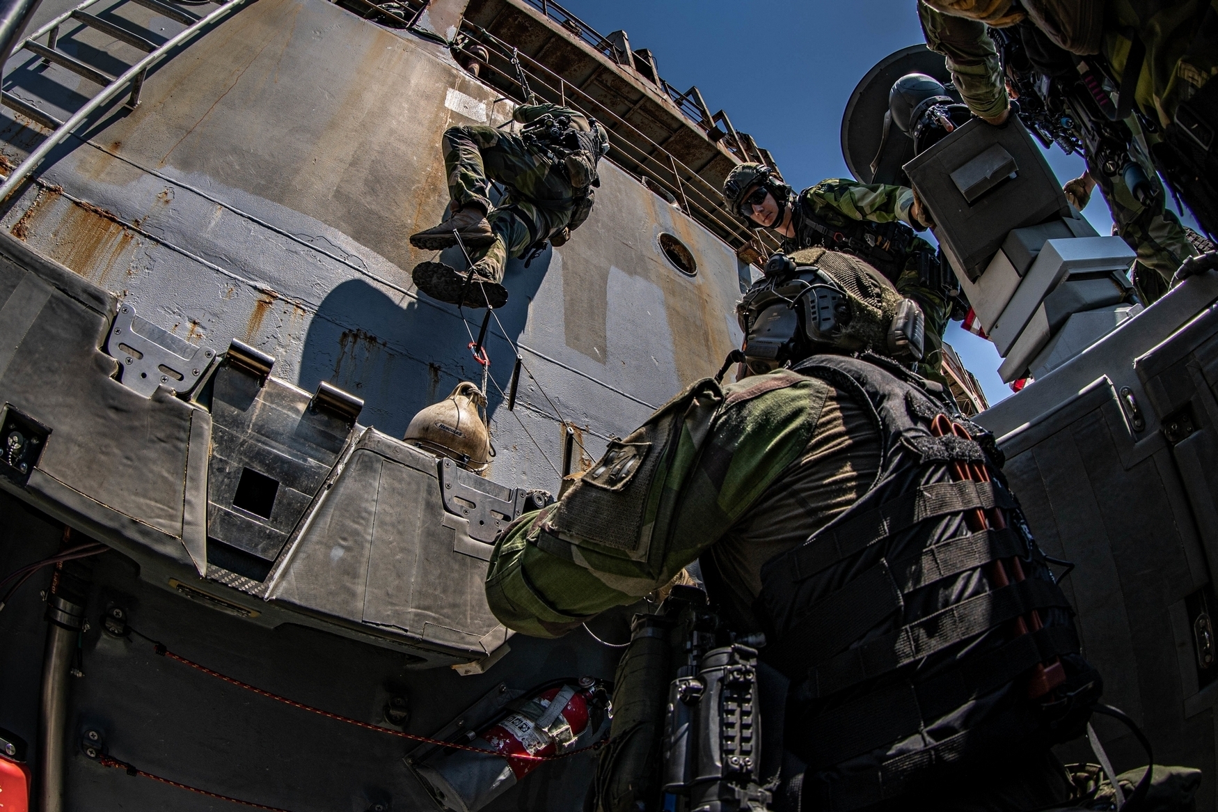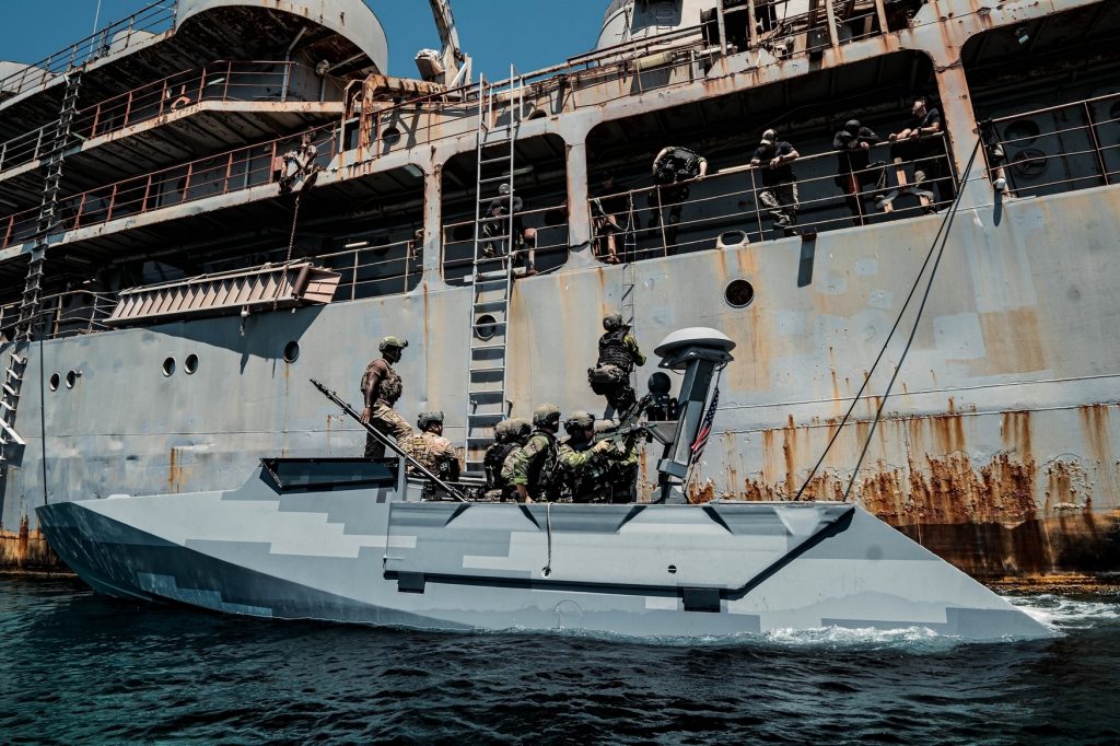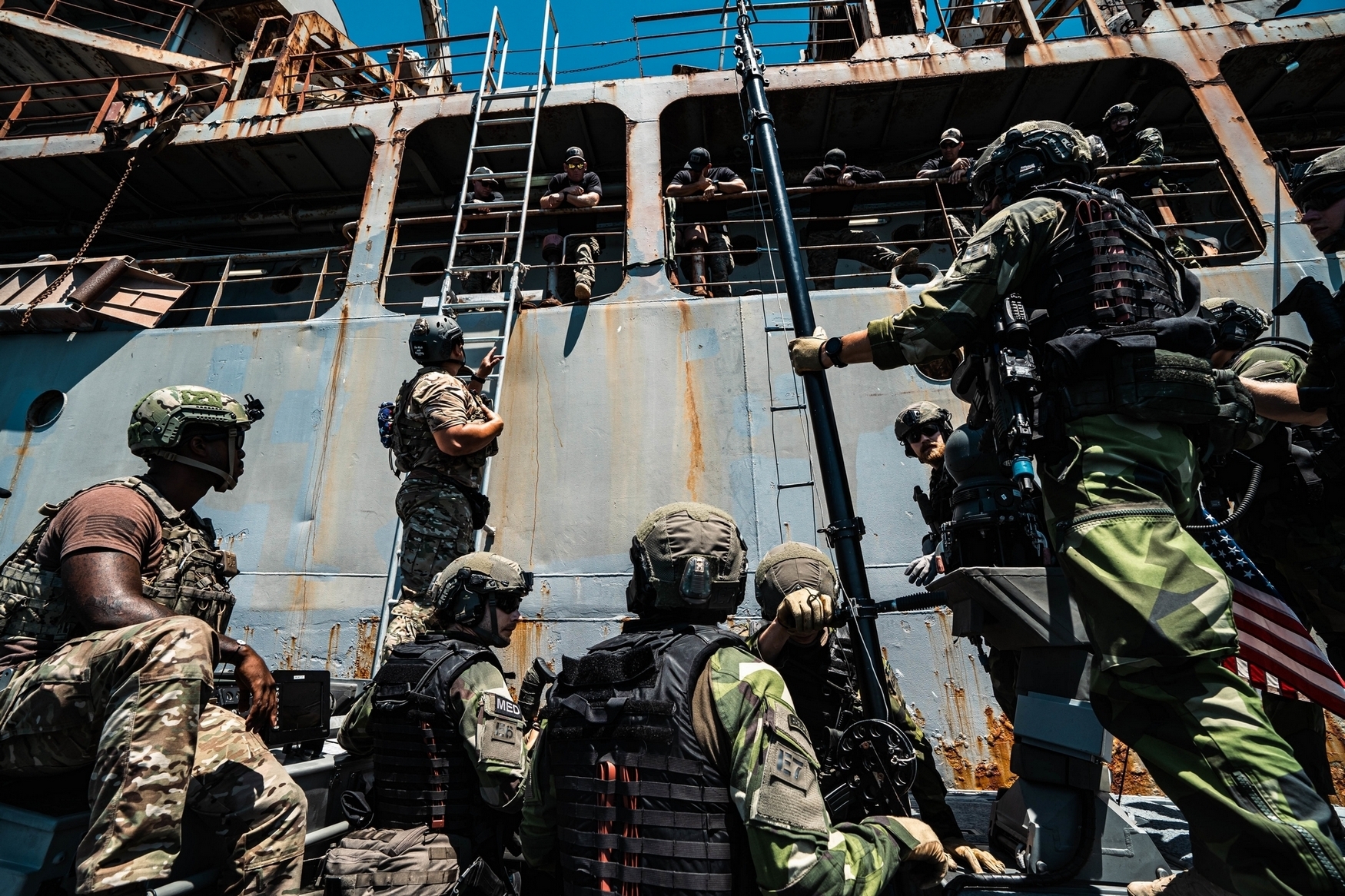 A U.S. Navy Sailor with Special Boat Team – TWELVE, U.S. Naval Special Warfare Group FOUR holds a caving ladder for Swedish Marines with 4th Marine Regiment, Swedish Amphibious Corps conducting a visit, board, search, and seizure during exercise TYR 22 at the NATO Maritime Interdiction Operational Training Centre (NMIOTC) in Souda bay, Greece, July 13, 2022. TYR 22 is a maritime interdiction operations exercise held at NMIOTC, bringing together Swedish Marines, U.S. Marines, U.S. Navy Special warfare combatant-craft crewmen to improve US and NATO Partner operational capacity, capability, and interoperability. (U.S. Marine Corps photo by Sgt. William Chockey)