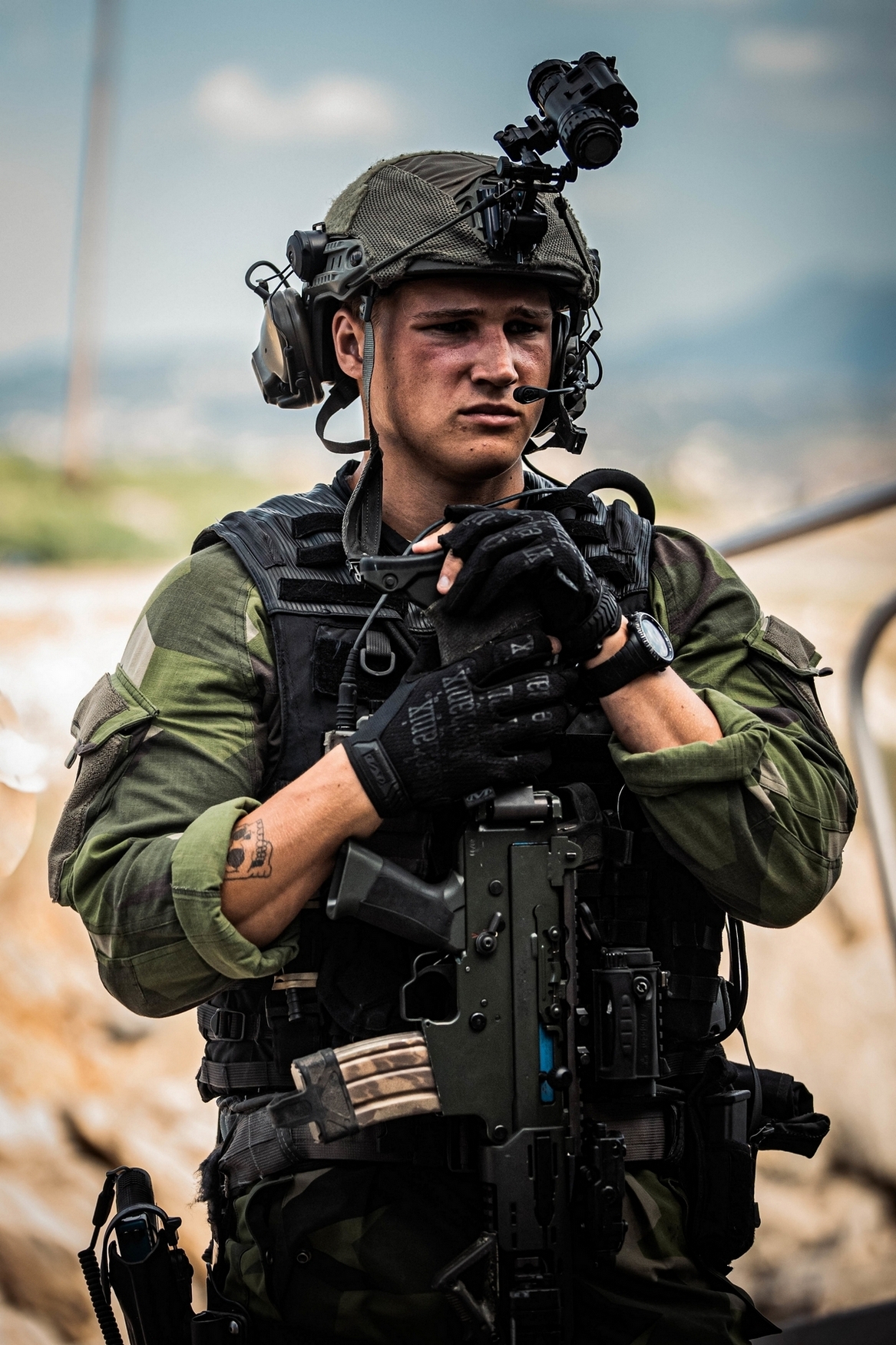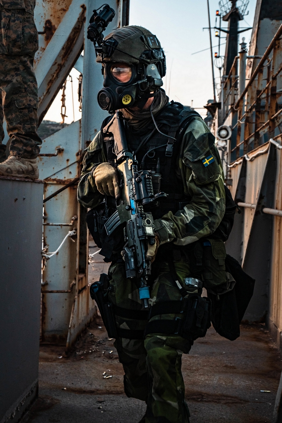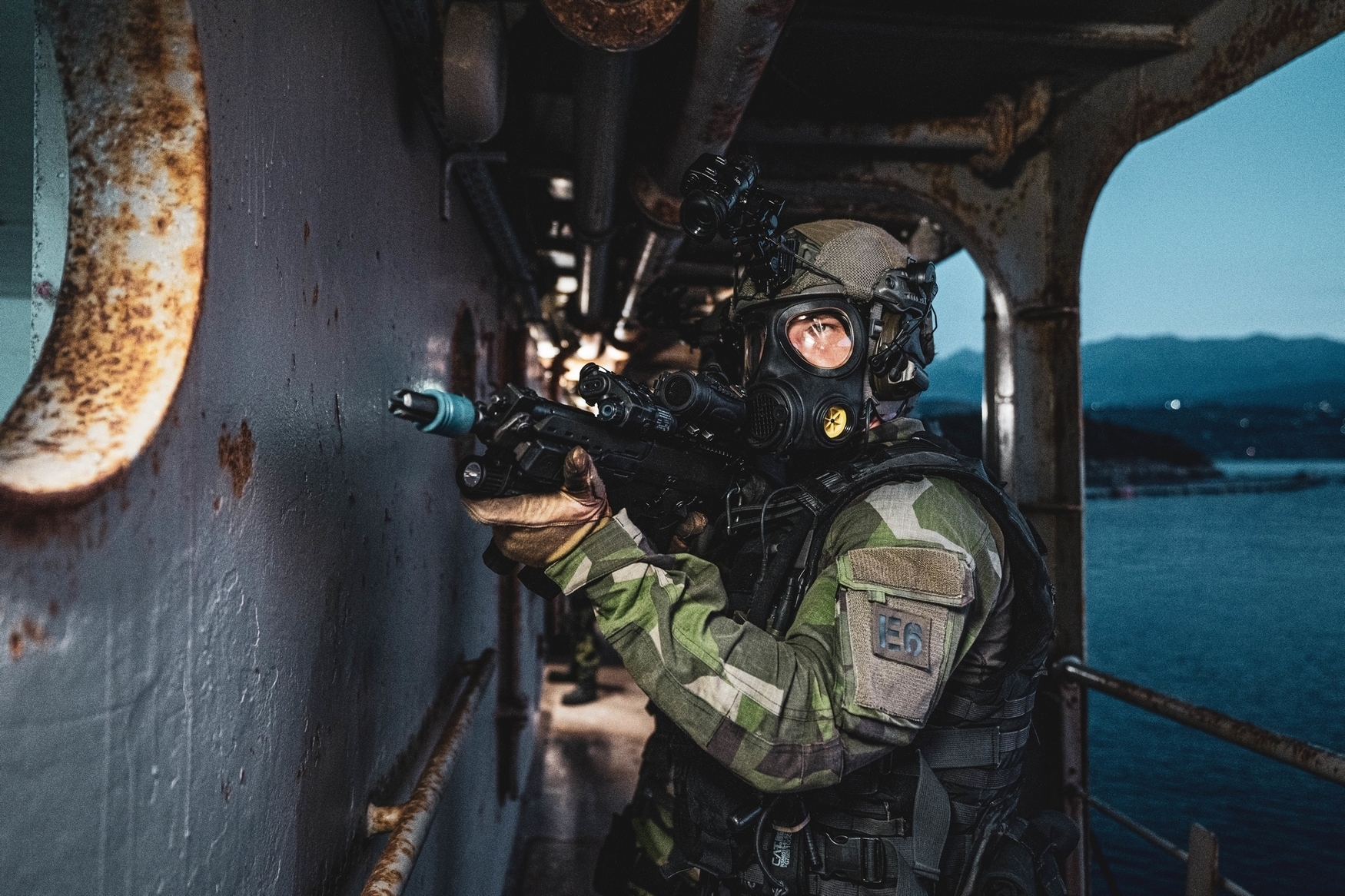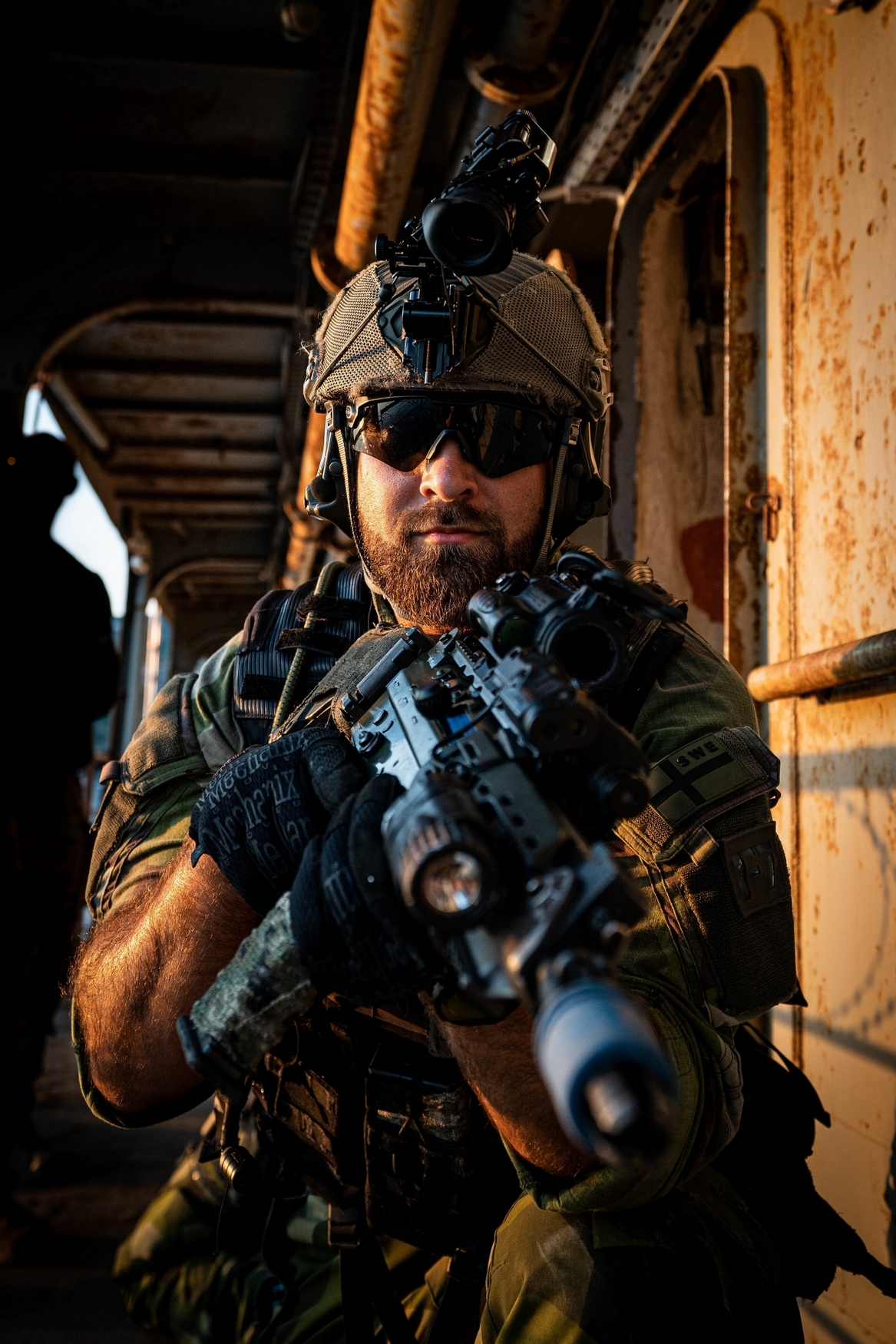 A Swedish Marine with 4th Marine Regiment, Swedish Amphibious Corps scans the area during a visit, board, search, and seizure for exercise TYR 22 at the NATO Maritime Interdiction Operational Training Centre (NMIOTC) in Souda bay, Greece, July 14, 2022. TYR 22 is a maritime interdiction operations exercise held at NMIOTC, bringing together Swedish Marines, U.S. Marines, U.S. Navy Special warfare combatant-craft crewmen to improve US and NATO Partner operational capacity, capability, and interoperability. (U.S. Marine Corps photo by Sgt. William Chockey)