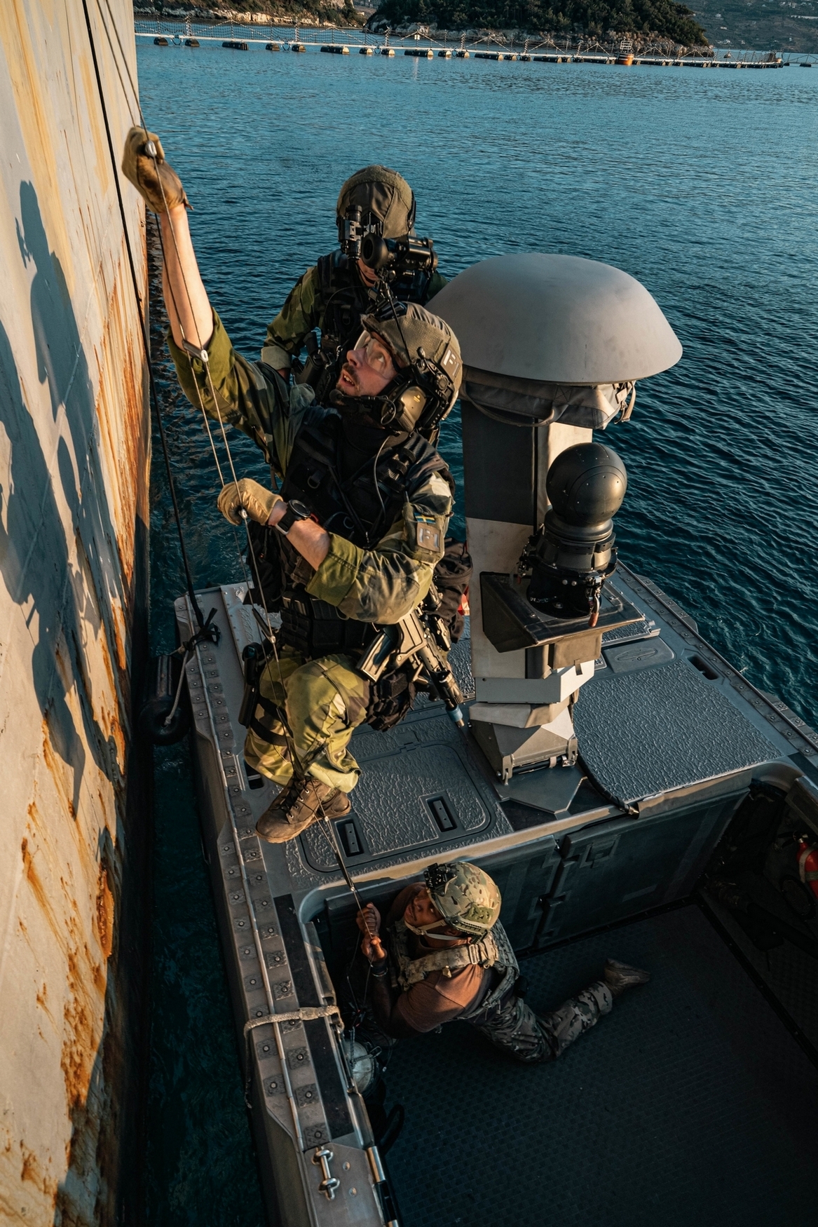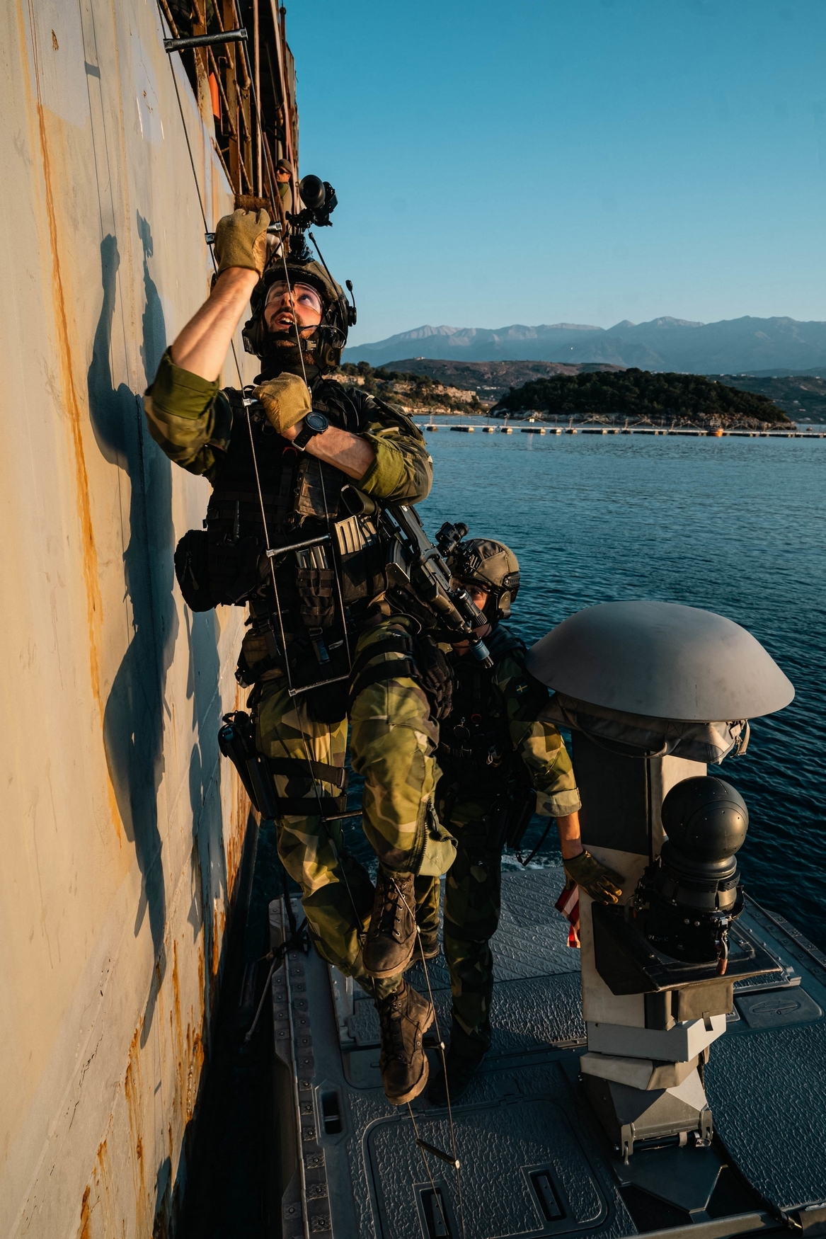 A Swedish Marine with 4th Marine Regiment, Swedish Amphibious Corps provides security during a hook and climb from a combat craft assault with Special Boat Team – TWELVE, U.S. Naval Special Warfare Group FOUR during exercise TYR 22 at the NATO Maritime Interdiction Operational Training Centre (NMIOTC) in Souda bay, Greece, July 13, 2022. TYR 22 is a maritime interdiction operations exercise held at NMIOTC, bringing together Swedish Marines, U.S. Marines, U.S. Navy Special warfare combatant-craft crewmen to improve US and NATO Partner operational capacity, capability, and interoperability. (U.S. Marine Corps photo by Sgt. William Chockey)