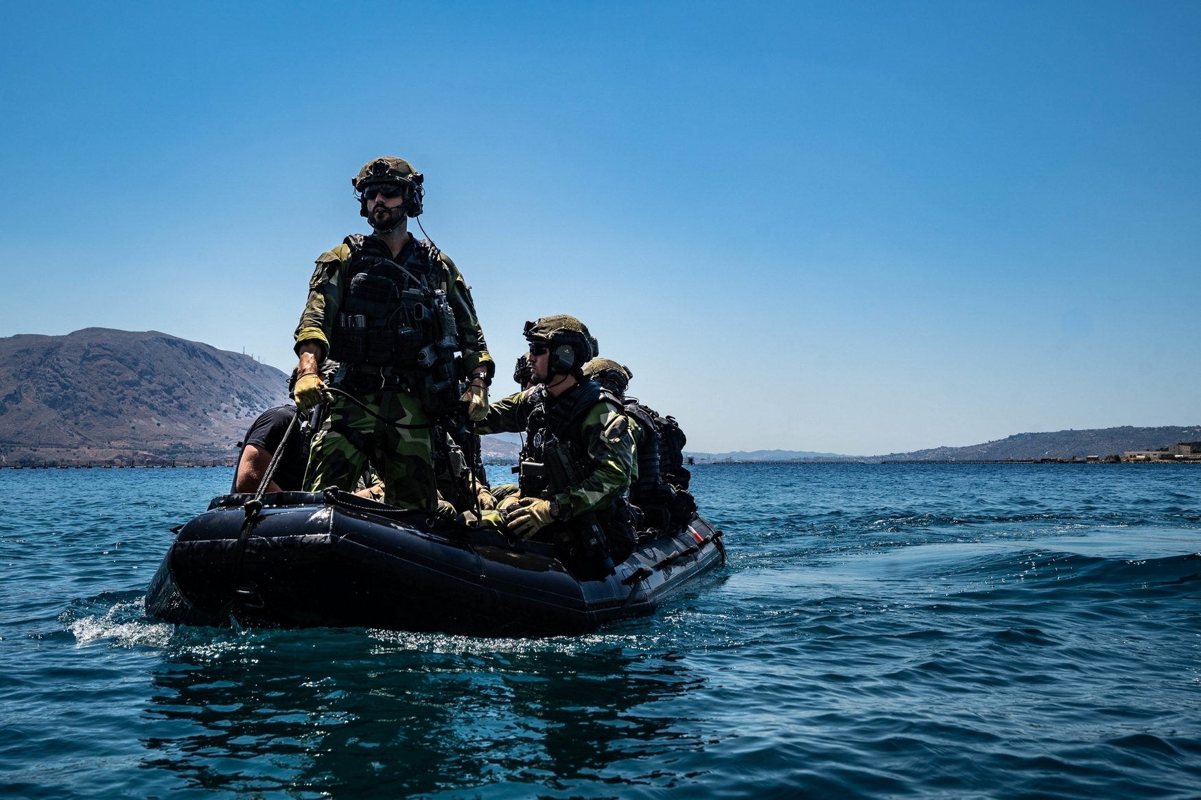 Swedish Marines with 4th Marine Regiment, Swedish Amphibious Corps ride a F470 combat rubber raiding craft during exercise TYR 22 at the NATO Maritime Interdiction Operational Training Centre (NMIOTC) in Souda bay, Greece, July 13, 2022. TYR 22 is a maritime interdiction operations exercise held at NMIOTC, bringing together Swedish Marines, U.S. Marines, U.S. Navy Special warfare combatant-craft crewmen to improve US and NATO Partner operational capacity, capability, and interoperability. (U.S. Marine Corps photo by Sgt. William Chockey)