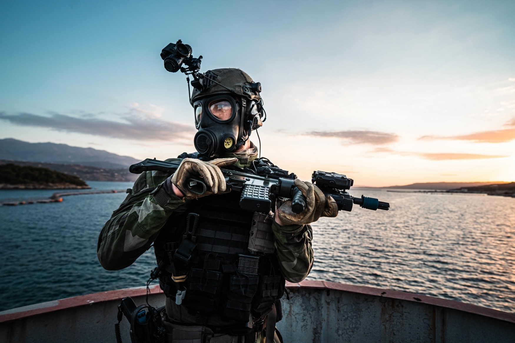 A Swedish Marine with 4th Marine Regiment, Swedish Amphibious Corps provides security for visit, board, search, and seizure during exercise TYR 22 at the NATO Maritime Interdiction Operational Training Centre (NMIOTC) in Souda bay, Greece, July 14, 2022. TYR 22 is a maritime interdiction operations exercise held at NMIOTC, bringing together Swedish Marines, U.S. Marines, U.S. Navy Special warfare combatant-craft crewmen to improve US and NATO Partner operational capacity, capability, and interoperability. (U.S. Marine Corps photo by Sgt. William Chockey)