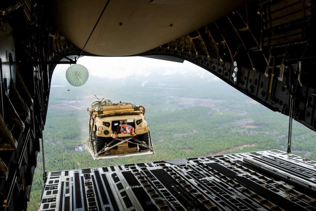 Στρατιώτες της 82ης Αερομεταφερόμενης Μεραρχίας πραγματοποιούν ρίψεις από αέρος πέντε διαμορφώσεων του νέου ελαφρού τακτικού οχήματος JLTV (Joint Light Tactical Vehicle) της Oshkosh Defense το οποίο προορίζεται να αντικαταστήσει εν μέρει το HMMWV στις αμερικανικές ένοπλες δυνάμεις.