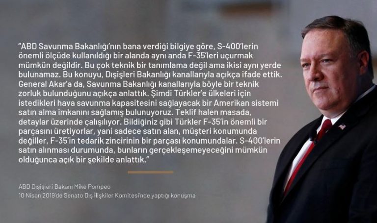 “S-400’lerin önemli ölçüde kullanıldığı bir alanda, aynı anda F-35’leri uçurmak mümkün değildir.” — ABD Dışişleri Bakanı Mike Pompeo @SecPompeo @StateDept pic.twitter.com/tsQr4wwpUw