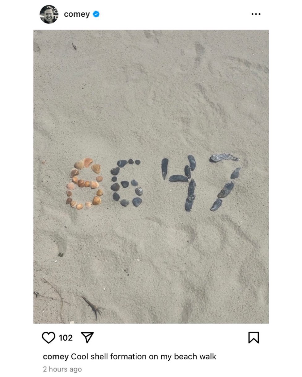 Σε ανάρτησή του στο Instagram που πλέον έχει διαγραφτεί, ο Τζέιμς Κόμι μοιράστηκε φωτογραφία στην οποία εικονίζονται κοχύλια που σχηματίζουν το μήνυμα «86 47» στην άμμο. Ο πρώτος αριθμός ενίοτε χρησιμοποιείται όταν θέλει κανείς να εκφράσει την επιθυμία να φύγει, ως ακόμη και να σκοτωθεί, κάποιος άλλος. Ο δεύτερος προφανώς παραπέμπει στον Ντόναλντ Τραμπ, τον (45ο και) 47ο πρόεδρο των ΗΠΑ.