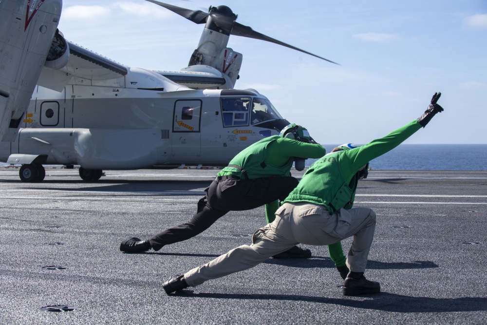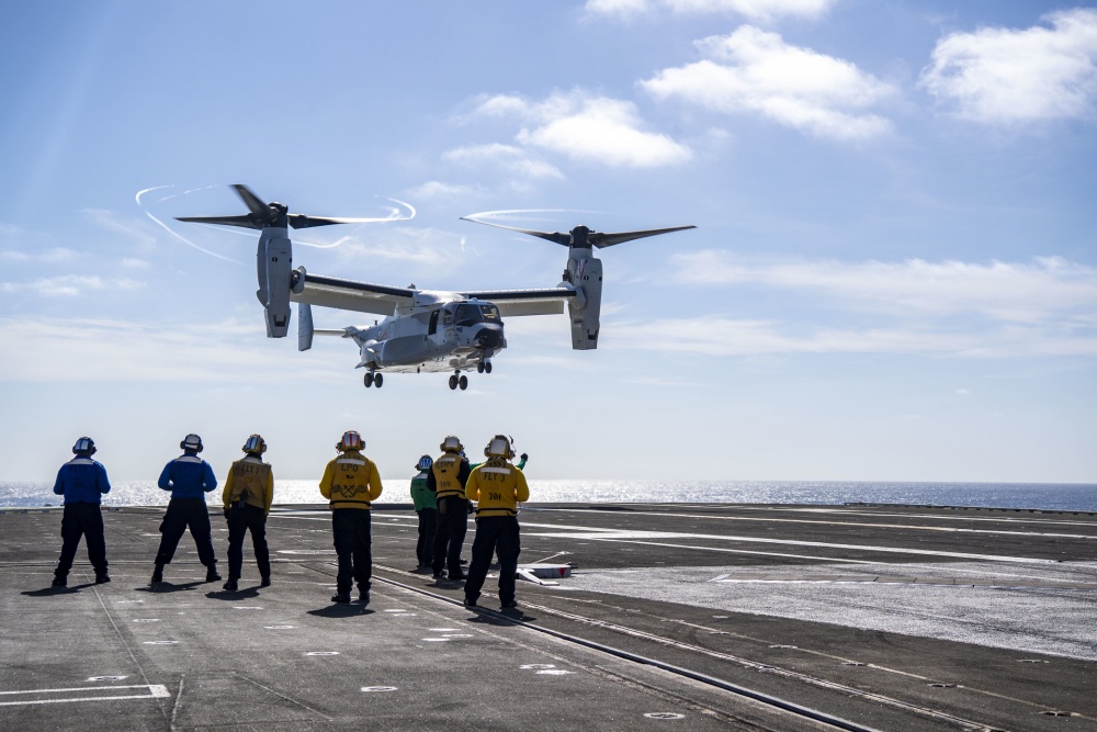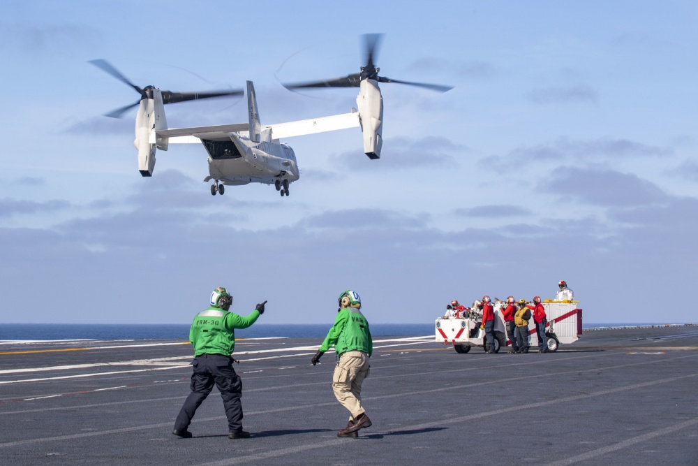 Ένα αεροσκάφος tiltrotor CMV-22B της Μοίρας Εφοδιαστικής Υποστήριξης του Στόλου VRM-30 ‘Titans’ πραγματοποίησε στις 20 Νοεμβρίου την πρώτη κανονική αποστολή COD (Carrier Onboard Delivery) σε αεροπλανοφόρο εν πλω, σε διάστημα λιγότερο από χρόνο από τις αρχικές πτητικές δοκιμές της ναυτικής έκδοσης του Osprey.