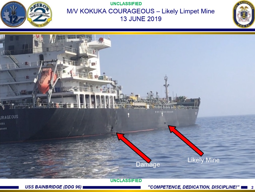Η αμερικανική Κεντρική Διοίκηση δημοσίευσε ένα βίντεο και φωτογραφίες που Αμερικανοί αξιωματούχοι δηλώνουν ότι αποτελούν αποδείξεις πως προσωπικό των Φρουρών της Επανάστασης του Ιράν επιτέθηκε σε δύο δεξαμενόπλοια στον Περσικό Κόλπο (συγκεκριμένα στον Κόλπο του Ομάν) την Πέμπτη.