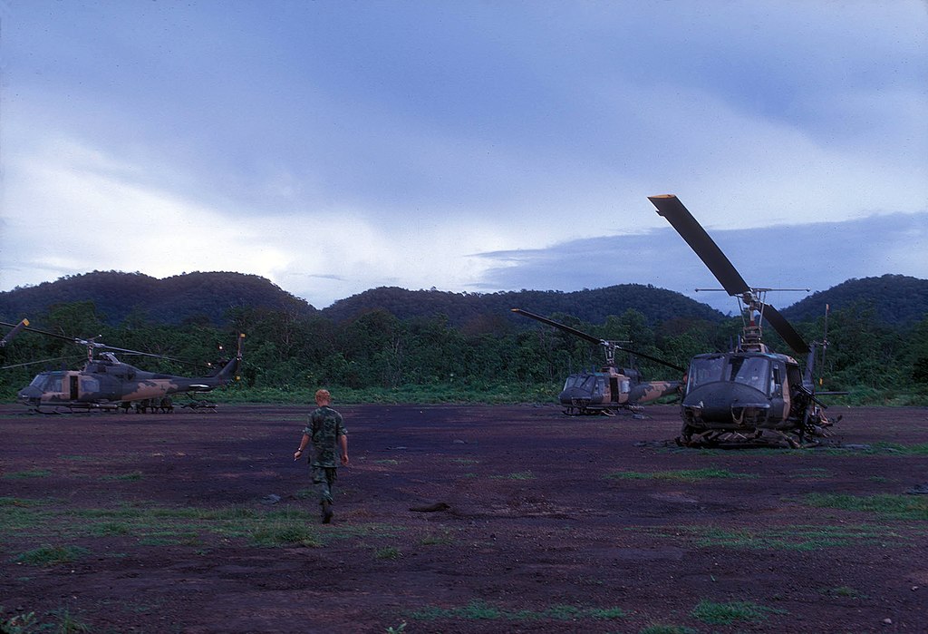 Hunter-killer team από Bell AH-1G Cobra και Hughes OH-6 Cayuse ανεφοδιάζεται σε πρόχειρη ζώνη προσγείωσης εντός του Ν. Βιετνάμ, διανοιχθείσα στη ζούγκλα με βόμβα των 15.000 λιβρών πυροδοτούμενη σε ύψος, κατά τις επιχειρήσεις της αμερικανικής εισβολής στην Καμπότζη την άνοιξη του 1970.
