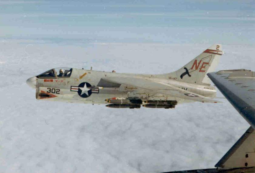 Vought A-7A Corsair II της VA-147 “Argonauts” από το USS Ranger πάνω από το Β. Βιετνάμ το 1968, με 12 Mk. 82 Snakeye. Οι «Αργοναύτες», σε όλη τους την ιστορία με τον ταιριαστό κωδικό κλήσης “Jason”, ήταν η πρώτη μοίρα που οδήγησε το Α-7Α στη μάχη το Νοέμβριο του 1967 στο Β. Βιετνάμ, η πρώτη που μετέπεσε στα ασύγκριτα ανώτερα Α-7Ε τρία χρόνια αργότερα, και – στην εποχή μας – η πρώτη που υιοθέτησε το περίφημο F-35C, μετά τα F/A-18C & -E, πάντα με έμβλημα το αρχαιοελληνικό ξίφος.