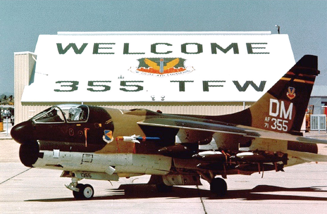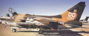 A-7D της 40th TFS, 355th TFW, Davis-Monthan AFB, Arizona, με κολοσσιαίο φορτίο από 24 επιβραδυνόμενες βόμβες Mk. 82 Snakeye και 2 AIM-9E. Η παρουσία του Avro Vulcan στο πλάνο υποδηλοί μάλλον αεροπορική έκθεση. Ναυτική κληρονομιά η αναδιπλούμενη σκάλα.