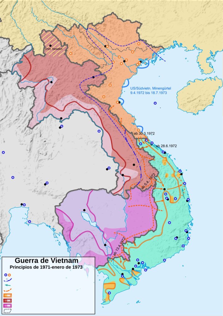 Χάρτης της ΝΑ Ασίας την εποχή των επιχειρήσεων (1971-73), με εμφανή τη διαδρομή του «Διαδρόμου του Χο Τσι Μινχ» ως πορτοκαλί διακεκομμένες γραμμές. Με πορτοκαλί απεικονίζεται το Β. Βιετνάμ, με τυρκουάζ το Ν. Βιετνάμ, με μπεζ η Κίνα και με γκρίζο η Ταϊλάνδη. Σε μωβ είναι η Καμπότζη, όπου η ανοικτή απόχρωση απεικονίζει τις περιοχές υπό τον έλεγχο της κυβέρνησης Λον Νολ και η σκούρη τις σταθερά κατεχόμενες από δυνάμεις του Β. Βιετνάμ ή και των γηγενών Ερυθρών Χμερ. Αντίστοιχα, σε ροζ είναι το Λάος: Η ανοικτή απόχρωση απεικονίζει τις περιοχές εκτός κομμουνιστικού ελέγχου (δηλαδή μόνο τις ευρισκόμενες κατά μήκος των συνόρων με την Ταϊλάνδη, στα βόρεια μόνο τη διοικητική πρωτεύουσα Luang Prabang και την κατ’ ουσίαν πρωτεύουσα Vientiane στα σύνορα με την Ταϊλάνδη, και λεπτή ζώνη υπό τον έλεγχο των Hmong στο νότιο τμήμα). Η σκούρη ροζ απόχρωση είναι το σταθερά κατεχόμενο από τους κομμουνιστές (ντόπιους Pathet Lao και Στρατό του Β. Βιετνάμ) τμήμα του Λάος, περιλαμβανομένης της διαδρομής του περιφήμου “Διαδρόμου”. Η συνεχής οδοντωτή πορτοκαλί γραμμή εντός του Ν. Βιετνάμ περιγράφει τα απώτατα όρια προέλασης του Βορειοβιετναμικού Στρατού μετά την “Πασχαλινή Εισβολή” του 1972, κατά τον Ιούνιο του ιδίου μήνα. Είναι προφανές ότι τεράστιο τμήμα της επικράτειας του Ν. Βιετνάμ κατελήφθη, ενώ ειδικά στα Κεντρικά Υψίπεδα (Αννάμ) οι νοτιοβιετναμικές δυνάμεις κατόρθωσαν να κρατήσουν μόνο την παράλια ζώνη με τις κολοσσιαίες αμερικανικές superbases. Φανερή και η τεράστια εξέχουσα Καμποτζιανού εδάφους (ελεγχομένου από το Β. Βιετνάμ) εντός του Ν. Βιετνάμ και πλησιέστατα στην πρωτεύσουσα του Νότου, Σαϊγκόν, που την καθιστούσε ευάλωτη.