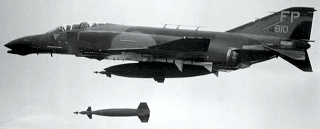 ΣΤ. 6 εμπρηστικές βόμβες BLU-27 ονομαστικής κλάσεως 750 λιβρών (στη ζυγαριά ήταν 873 λίβρες), με περιεχόμενο 380 λίτρα Napalm-B (ήτοι αεροπορικού καυσίμου JP-4 με δύο παράγοντες αύξησης του ιξώδους) και με ασυνήθιστο για όπλο του είδους ουραίο πτέρωμα. Το θηριώδες μέγεθός τους καθιστούσε αναγκαίο το συνδυασμό απευθείας ανάρτησης από μιας στους άπω φορείς και από δύο σε ΜΕR υπό τους μέσους φορείς αντιδιαμετρικά μπρος-πίσω για μέγιστο αεροδυναμικό αποχωρισμό κατά την άφεση.